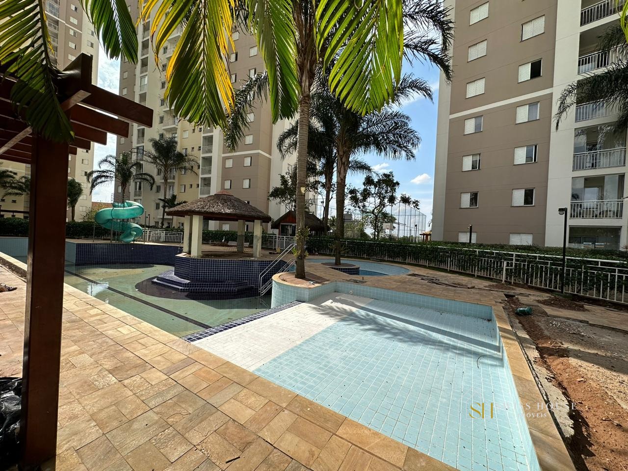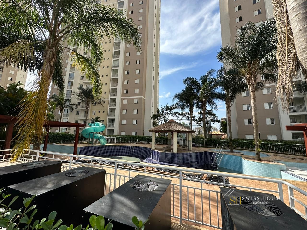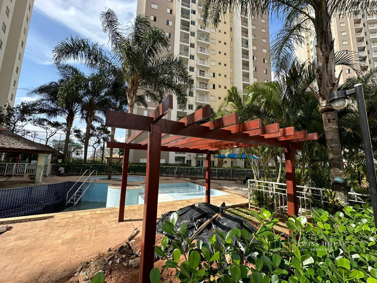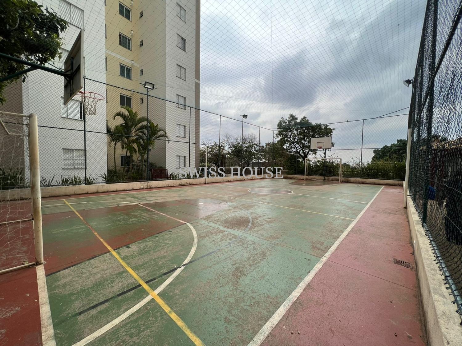 Condomínio com academia, salão de festas, quadra poliesportiva, piscina, portaria 24h, espaço gourmet na área comum e playground.
