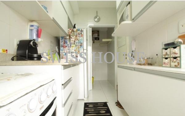 A cozinha é completa, equipada com fogão, geladeira, micro-ondas, máquina de café expresso e filtro de água, tudo distribuído de forma prática e funcional, garantindo comodidade no dia a dia.