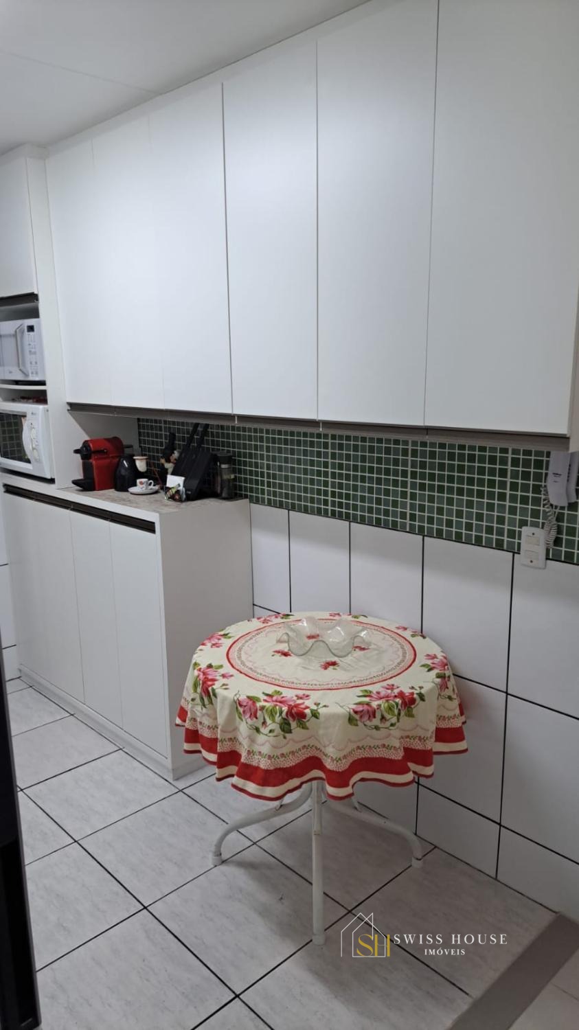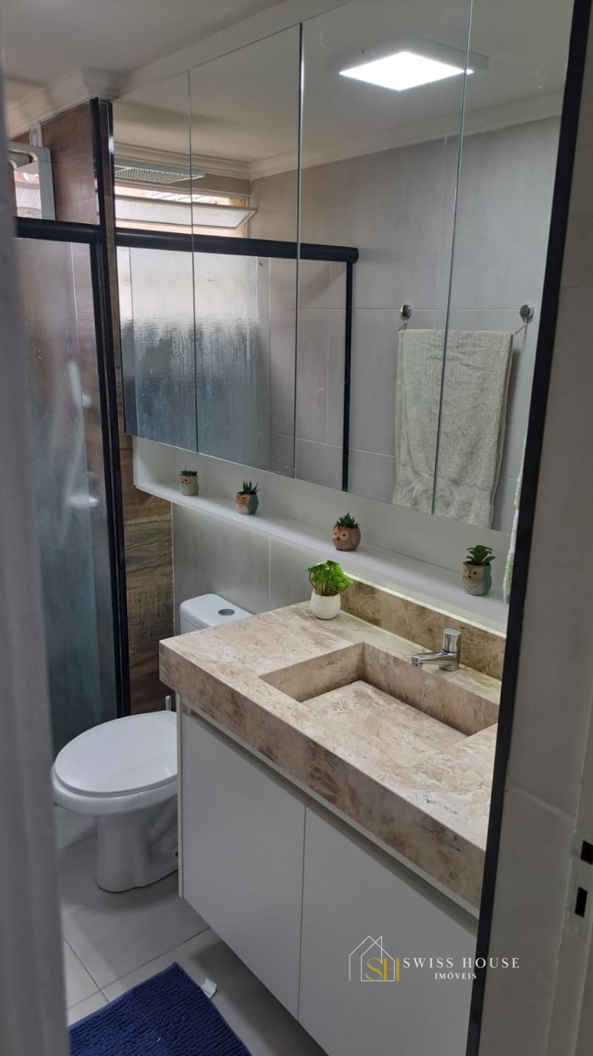 Apartamento de 74m² com 3 quartos, sala ampla, cozinha com armários, banheiro com box e gabinete, lavanderia e 1 vaga de garagem coberta.