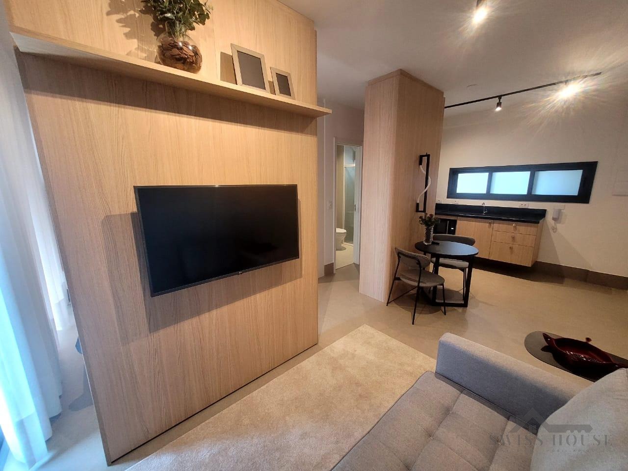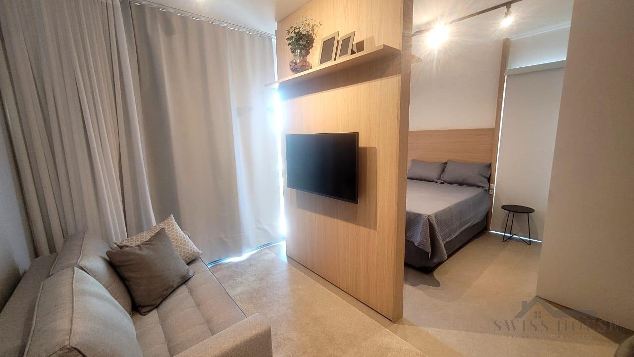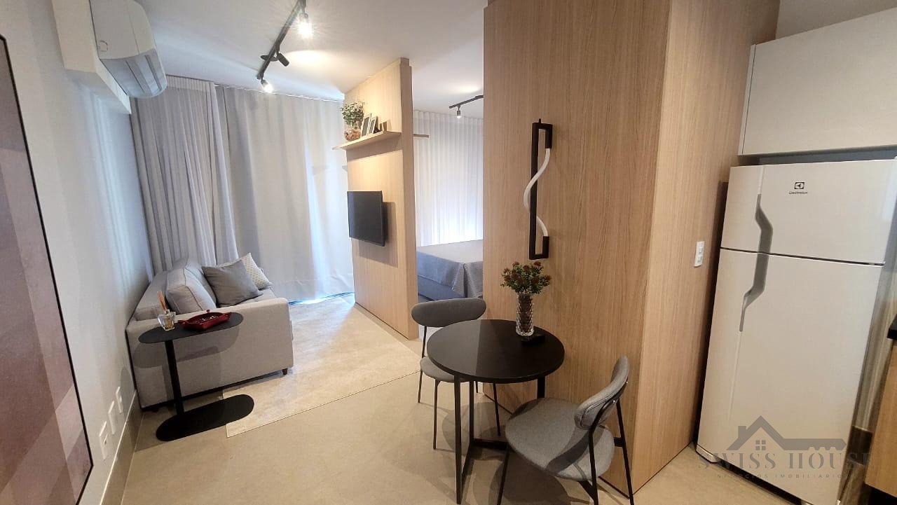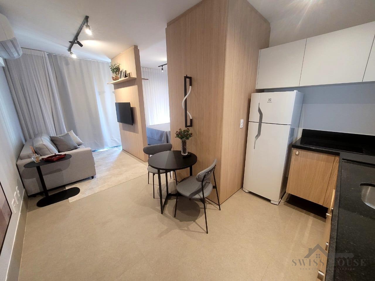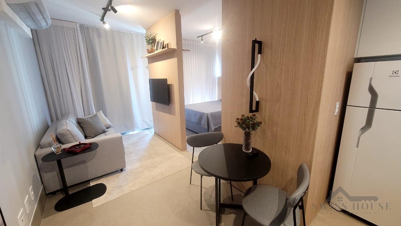 Este apartamento moderno e mobiliado oferece praticidade e conforto em cada detalhe. A sala, equipada com sofá, TV e cama, integra-se à cozinha funcional, que dispõe de cooktop, micro-ondas, geladeira e mesa para duas pessoas, criando um ambiente completo e bem aproveitado.