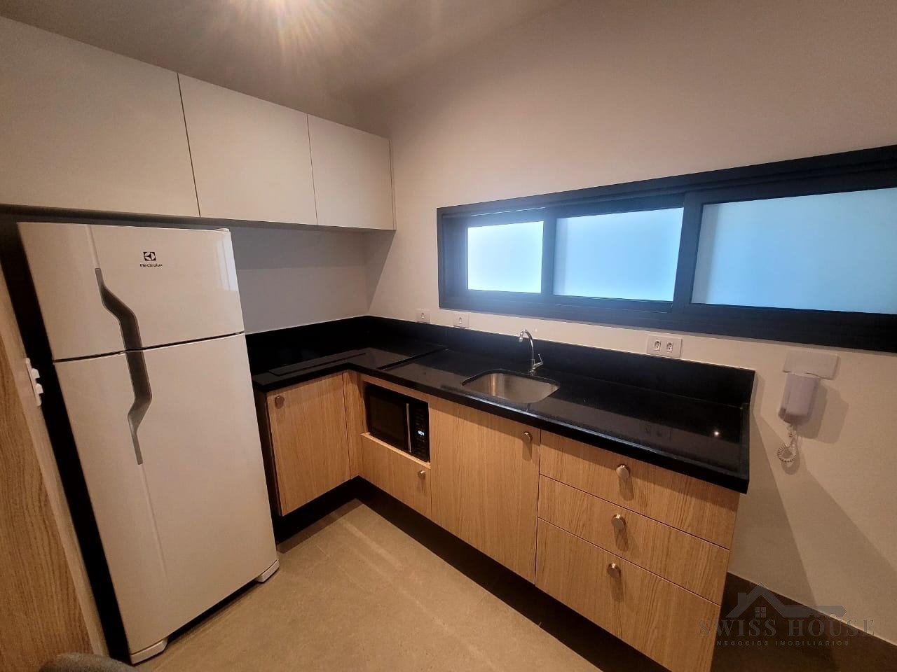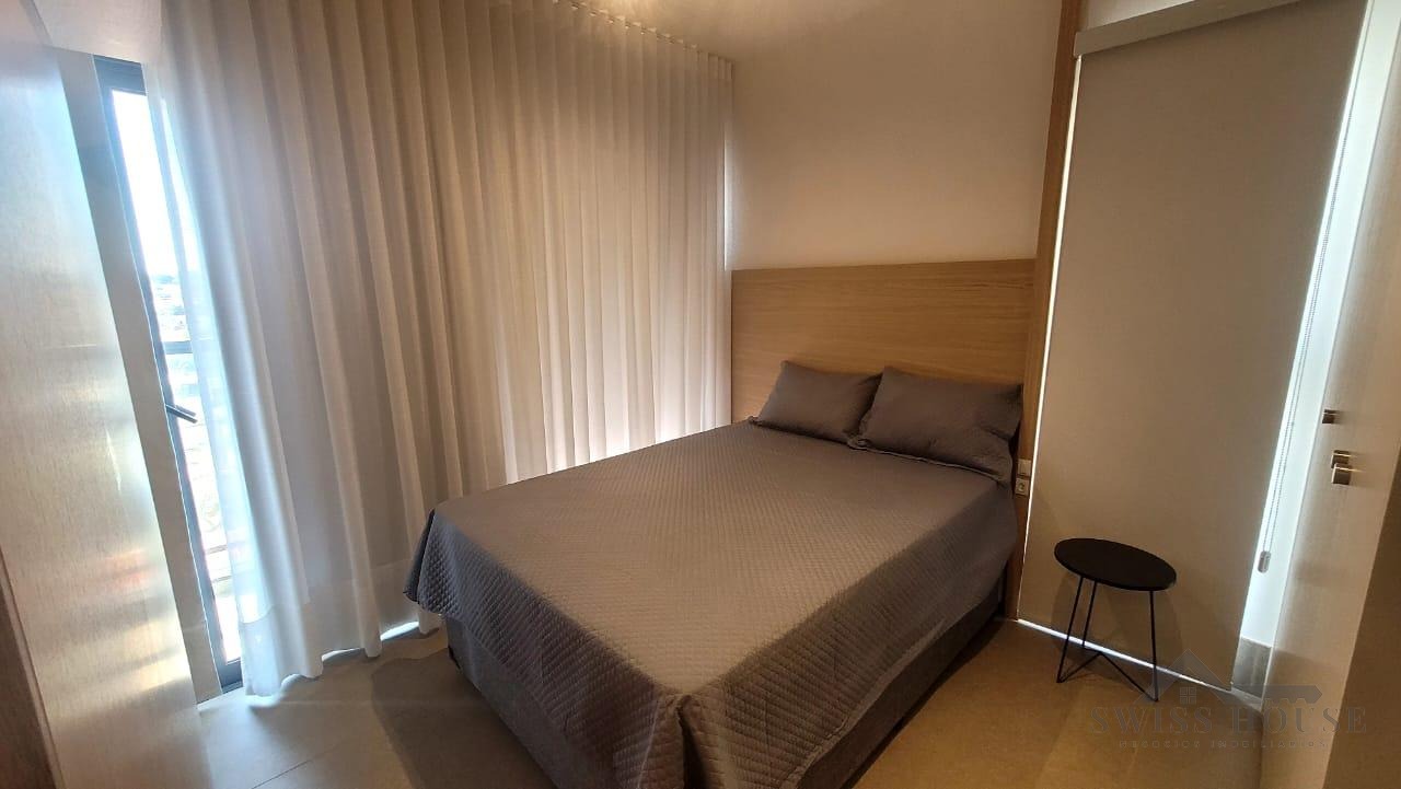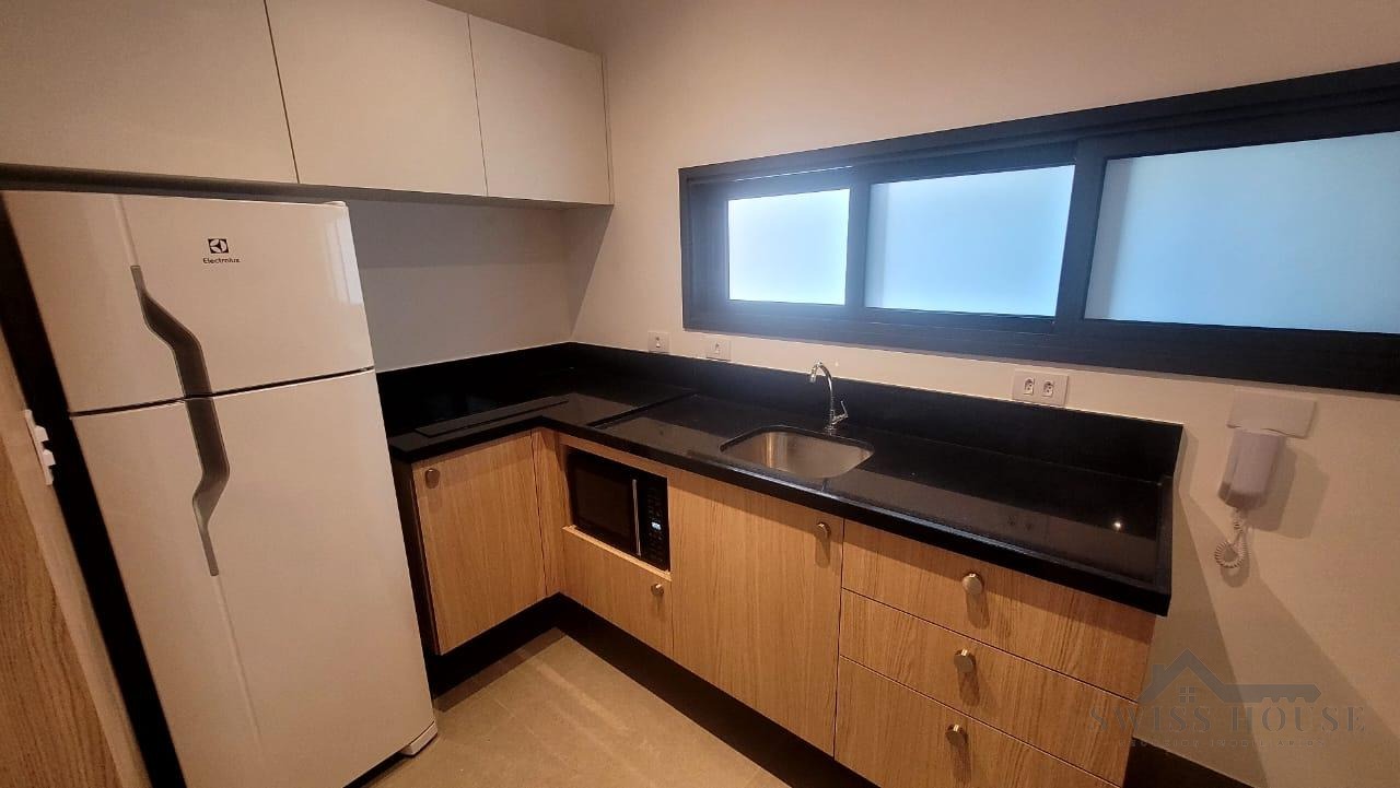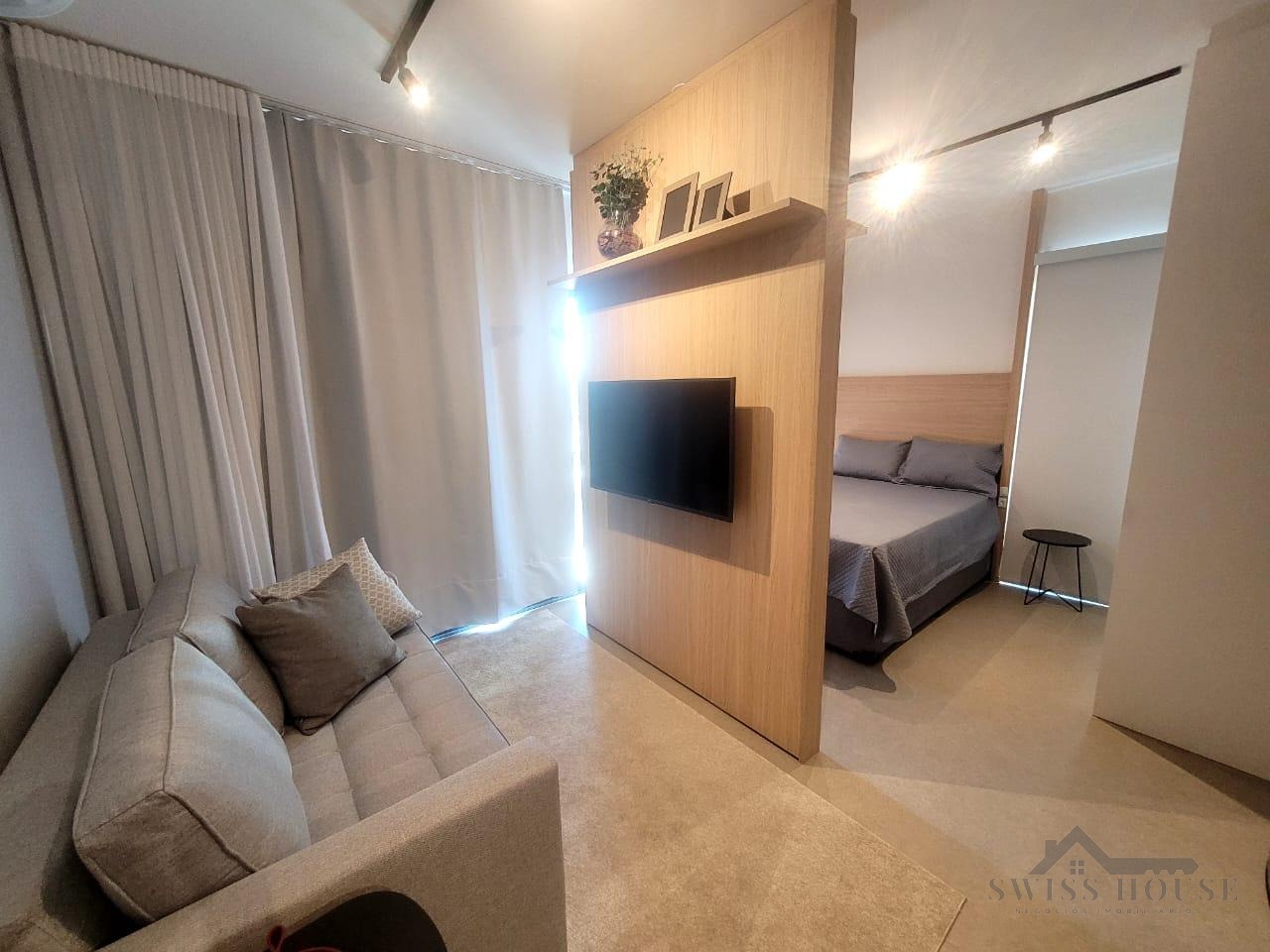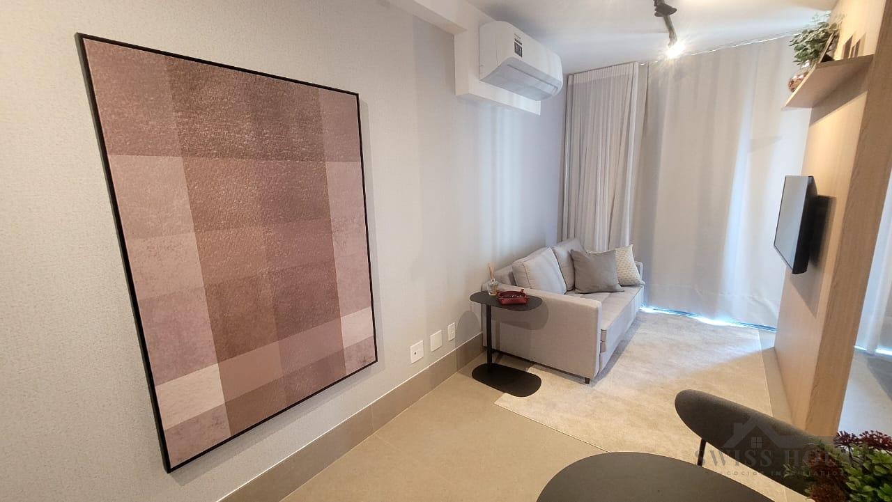 Este apartamento moderno e mobiliado oferece praticidade e conforto em cada detalhe. A sala, equipada com sofá, TV e cama, integra-se à cozinha funcional, que dispõe de cooktop, micro-ondas, geladeira e mesa para duas pessoas, criando um ambiente completo e bem aproveitado.