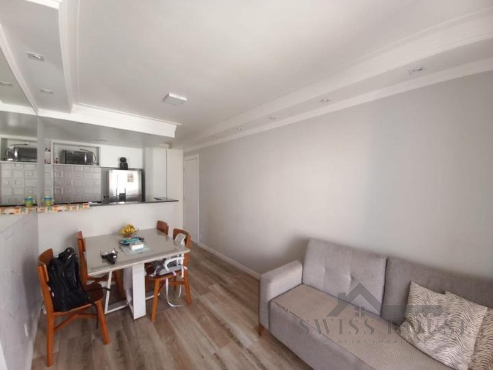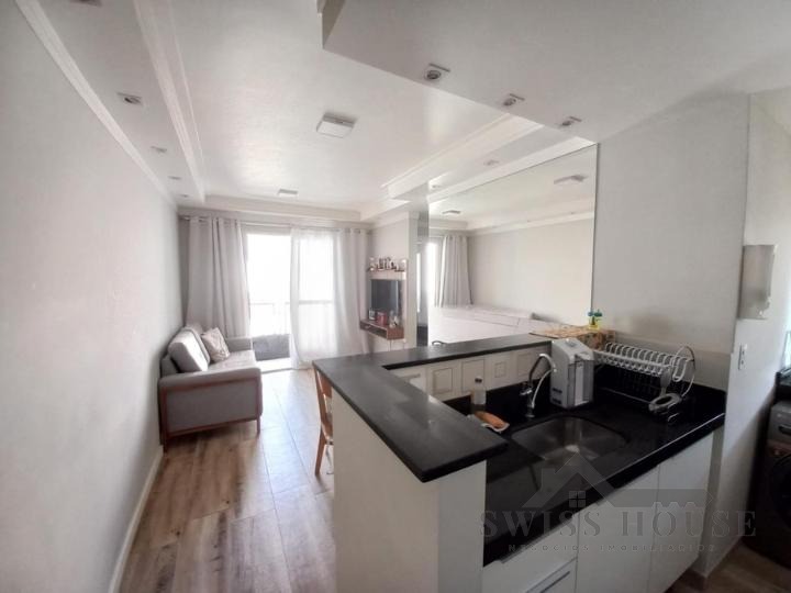 Apartamento com 2 dormitórios planejados, cozinha americana com bancada e armários sob medida, área de serviço funcional, banheiro com ótimo acabamento e sala com mesa fixa em canto alemão, painel para TV e sacada, oferecendo um ambiente acolhedor e bem aproveitado.