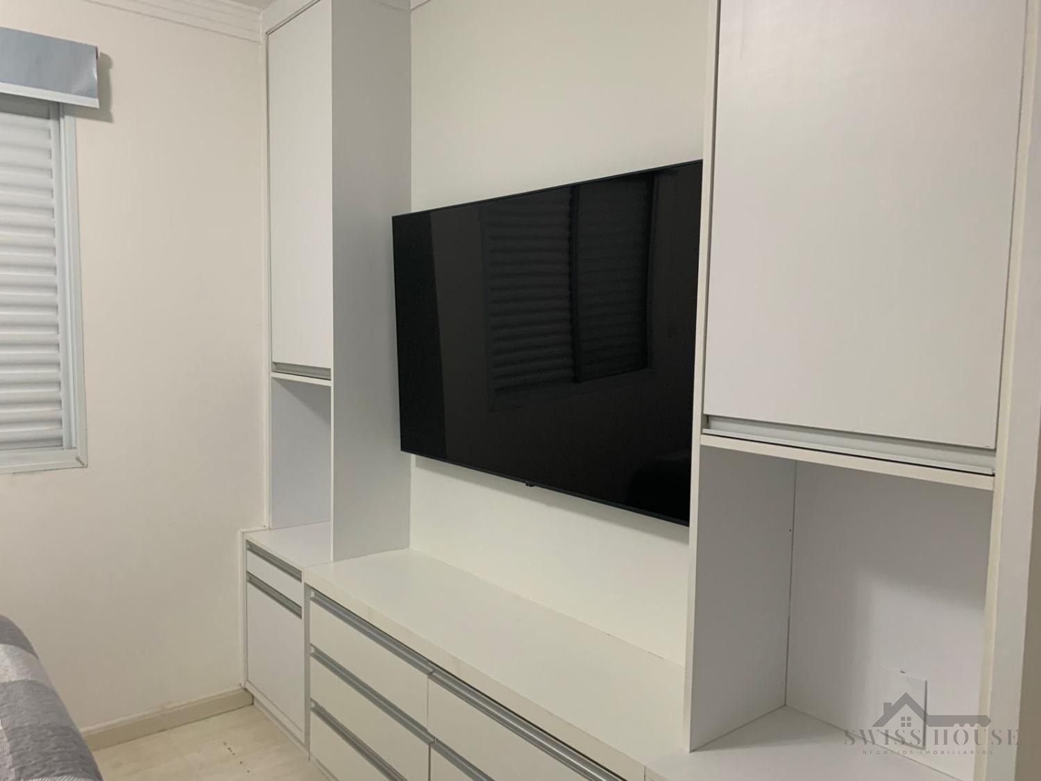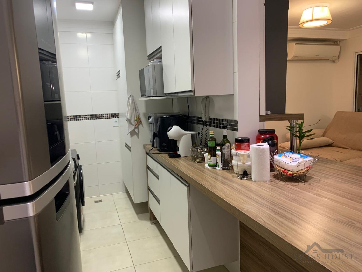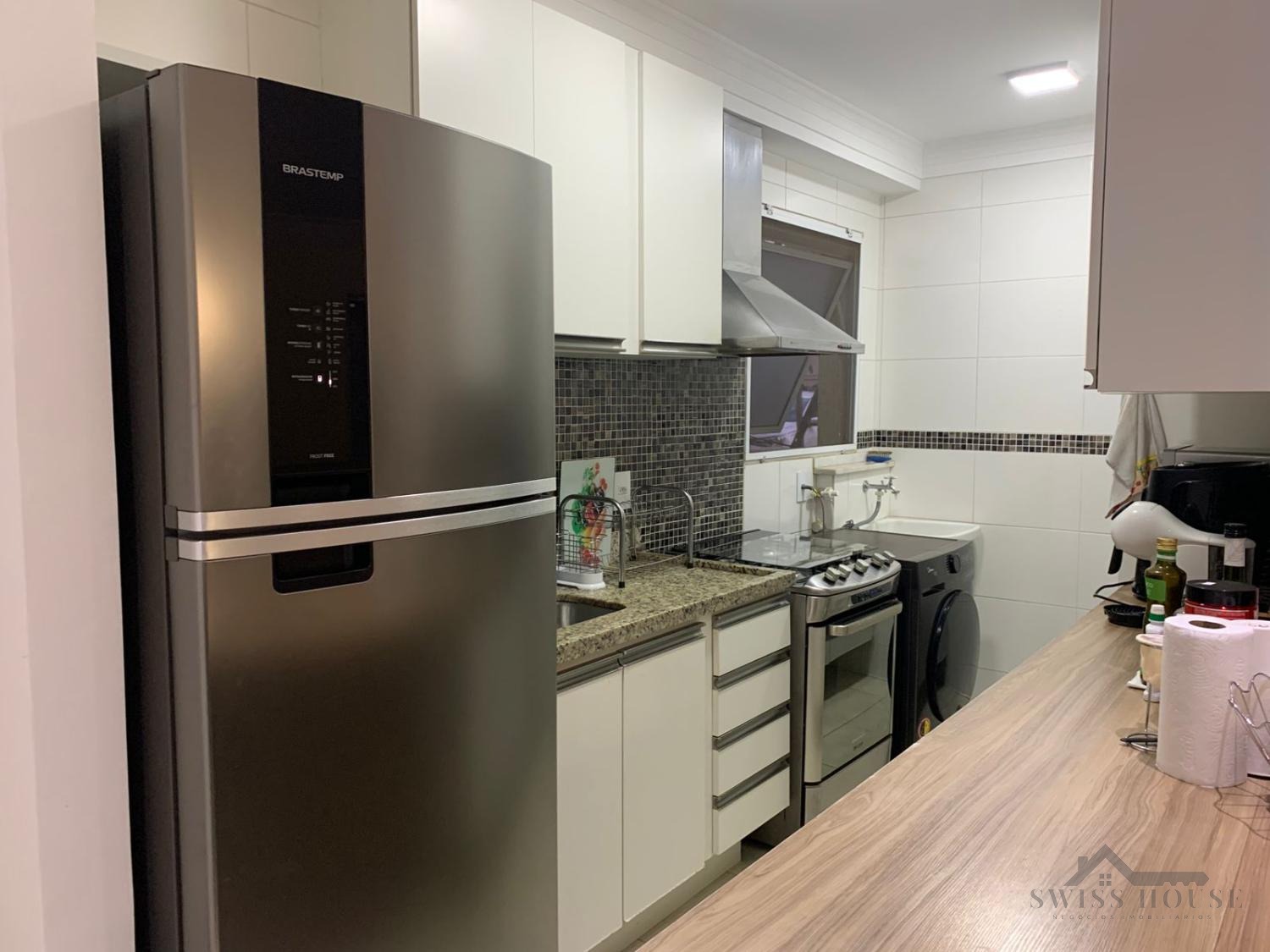 Apartamento moderno e funcional, com 3 quartos equipados com armários planejados, sendo 1 suíte. A cozinha americana é rica em armários, proporcionando praticidade e organização, e integrada à área de serviço.