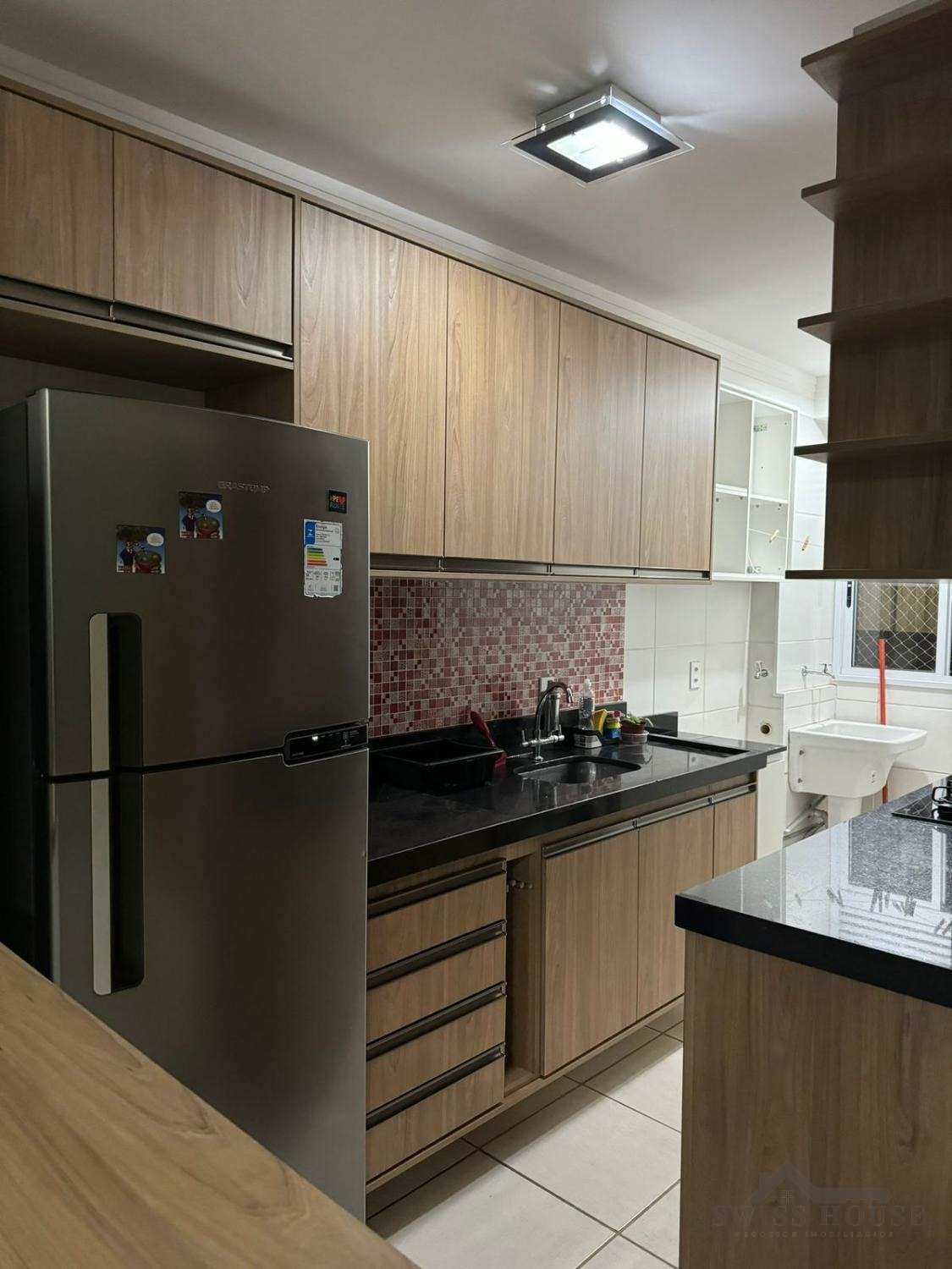 A cozinha americana planejada integra-se à lavanderia, também com armários, trazendo praticidade ao dia a dia. O banheiro possui box em vidro blindex e acabamento de qualidade. O imóvel ainda dispõe de 1 vaga de garagem coberta.