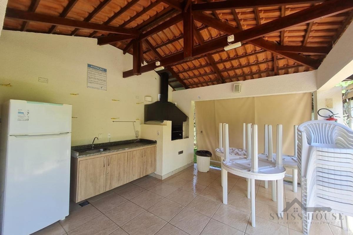 O condomínio com churrasqueira, salão de festas, quadra poliesportiva e playground, além de portaria 24h.