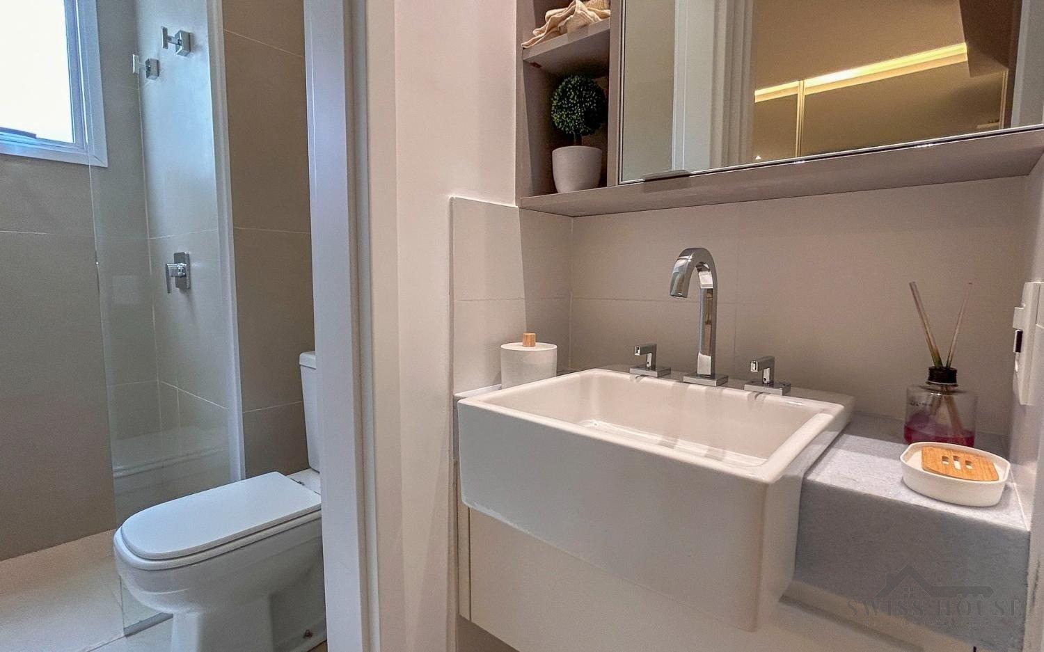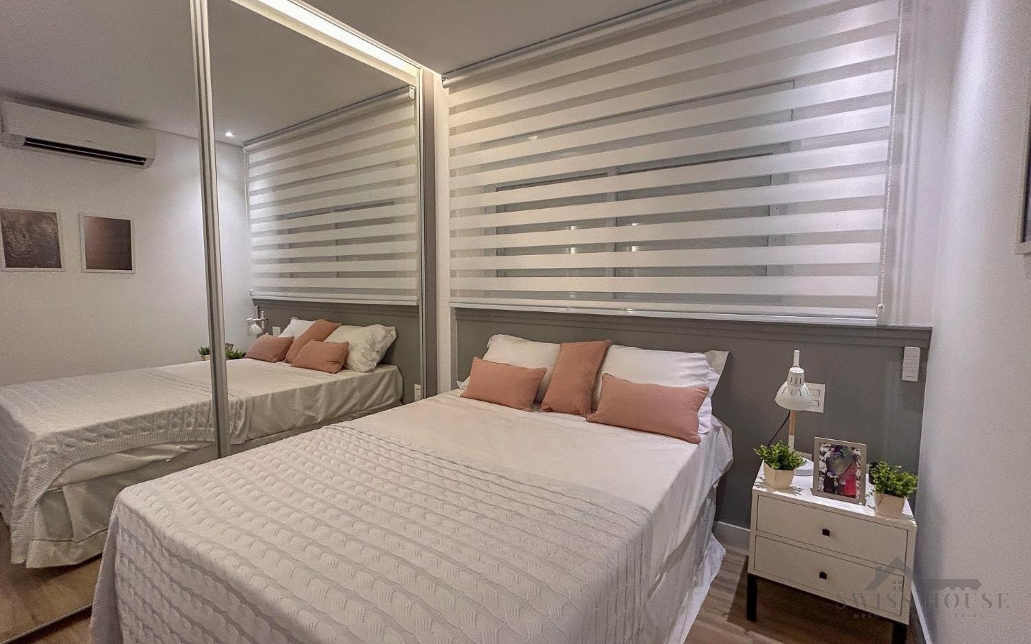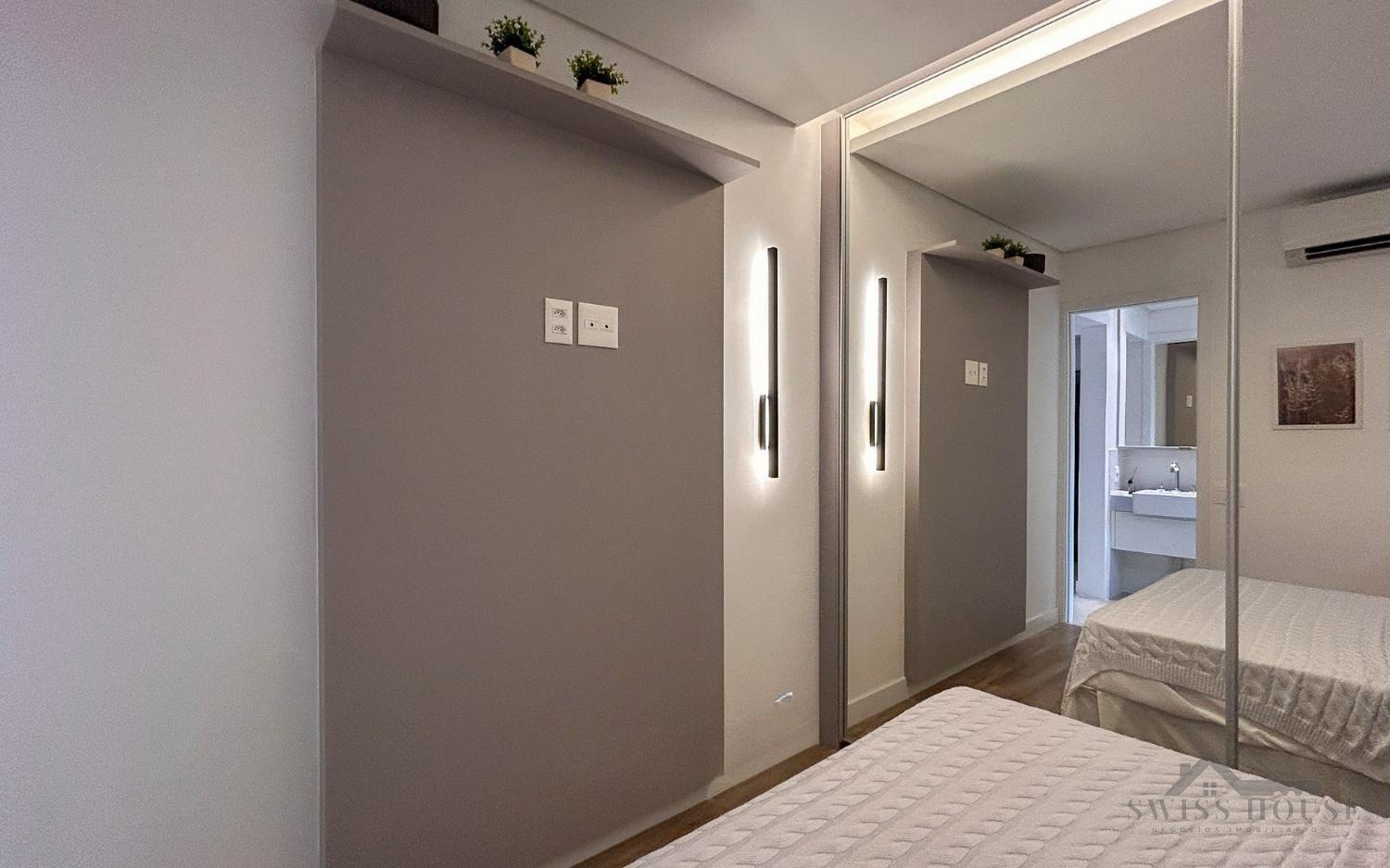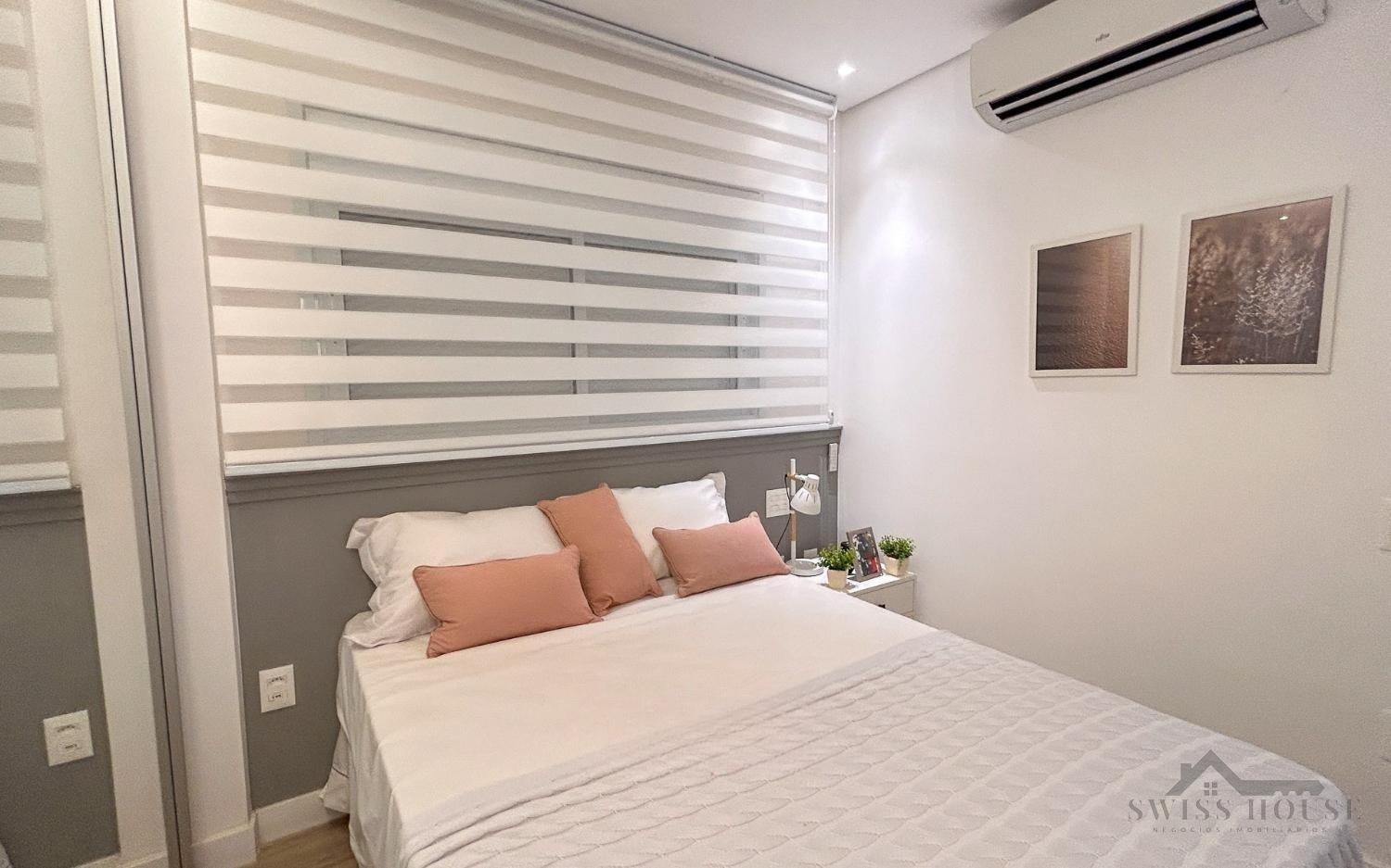 A cozinha é equipada com bancadas em granito Preto São Gabriel, enquanto o banheiro conta com bancada em mármore branco extra e nichos embutidos, unindo funcionalidade e elegância. Para mais segurança e praticidade, o imóvel dispõe de fechadura eletrônica e janelas com persianas automatizadas, garantindo controle de luminosidade e comodidade no dia a dia. Possui ainda infraestrutura pronta para instalação de ar-condicionado.