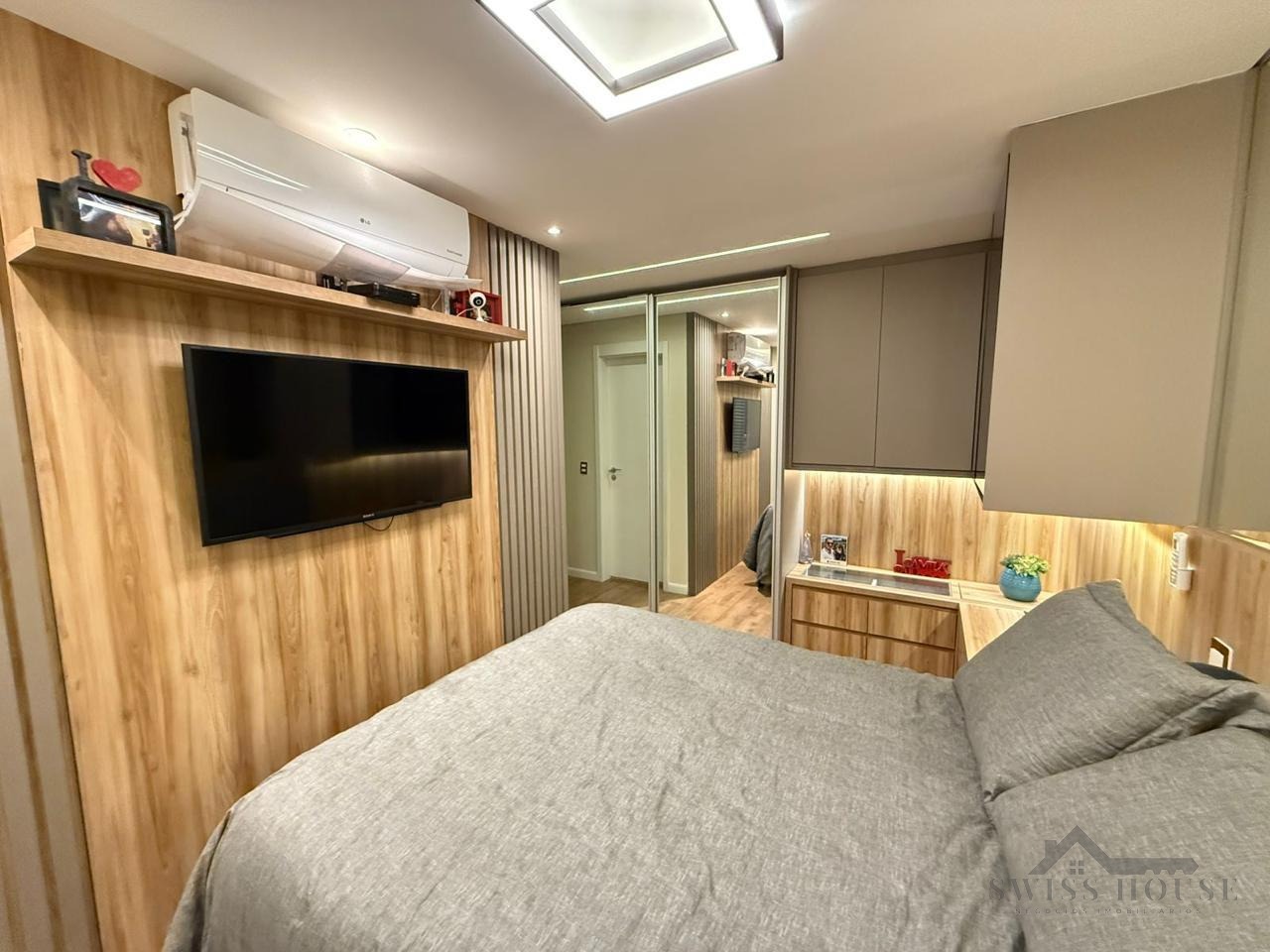 Com 2 quartos, sendo 1 suíte com móveis planejados, cama de casal, TV smart 43, banheiro social, sala com sofá retrátil, puffs e TV Samsung smart 55, sacada gourmet, cozinha completa com armários, geladeira, microondas, cooktop, forno elétrico, máquina lavar, seca 11kg, mesa de jantar para até 8 lugares, ar condicionado LG em todos os ambientes, fechadura digital Weg home com senha e biométrica e 2 vagas de garagem gaveta cobertas.