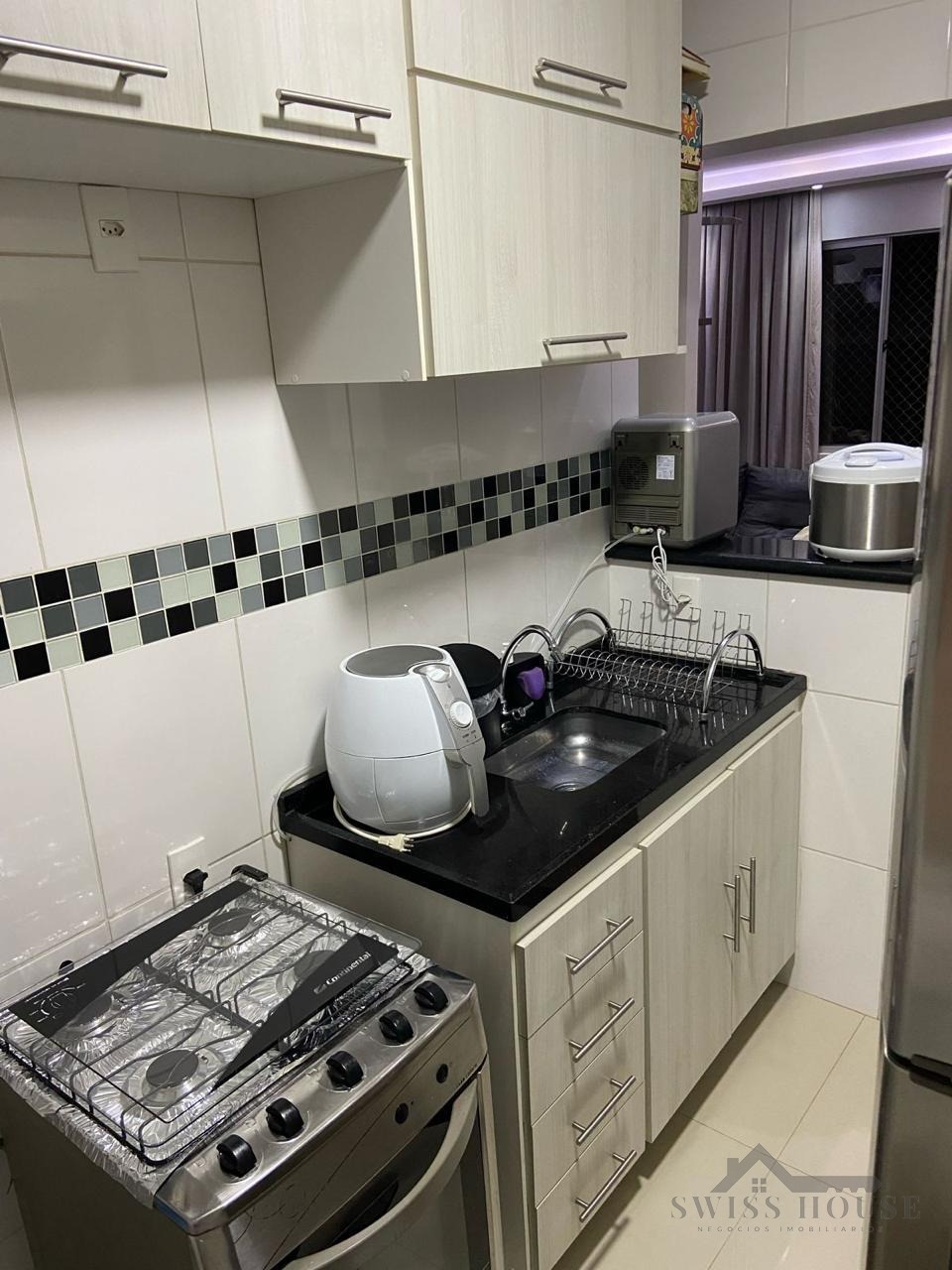 A sala para dois ambientes é aconchegante e bem iluminada, perfeita para convivência e recepção. A cozinha planejada oferece praticidade e ótimo padrão de acabamento, integrada à área de serviço.