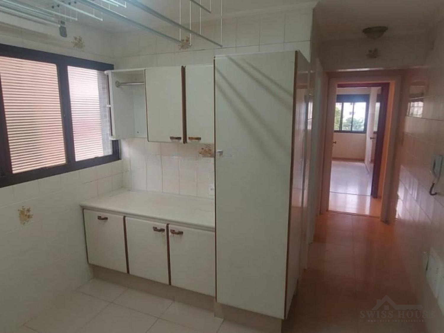 A cozinha original com armários é espaçosa e funcional, complementada por dormitório e banheiro de serviço, além de armários no corredor, ampliando as áreas de armazenamento.
