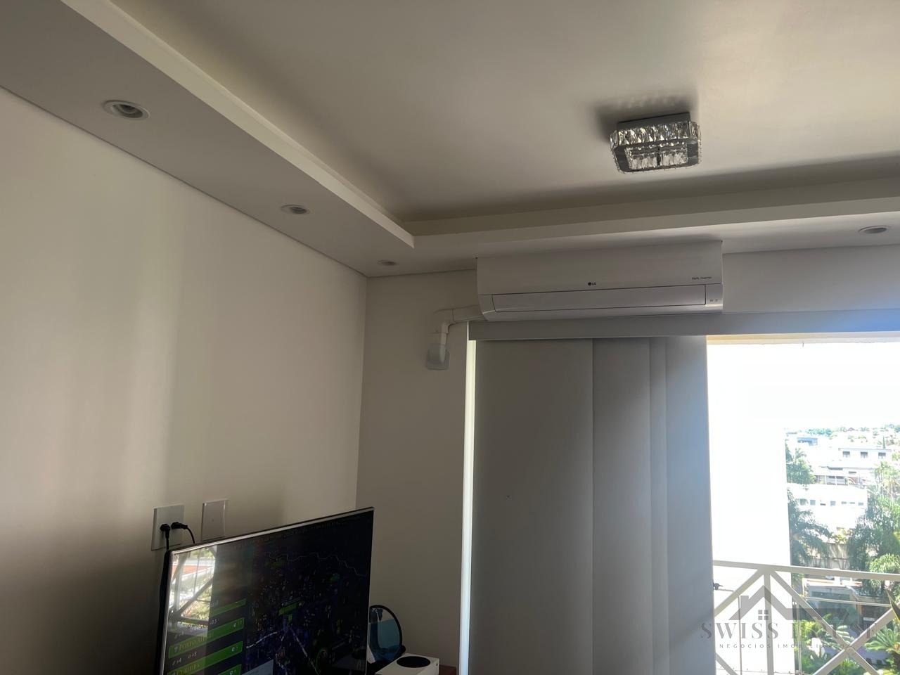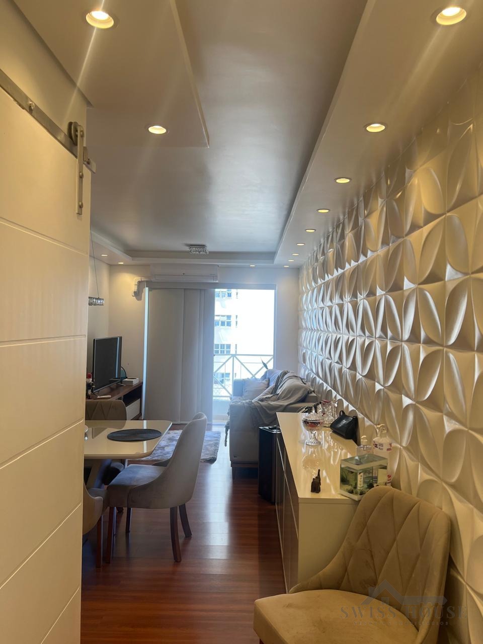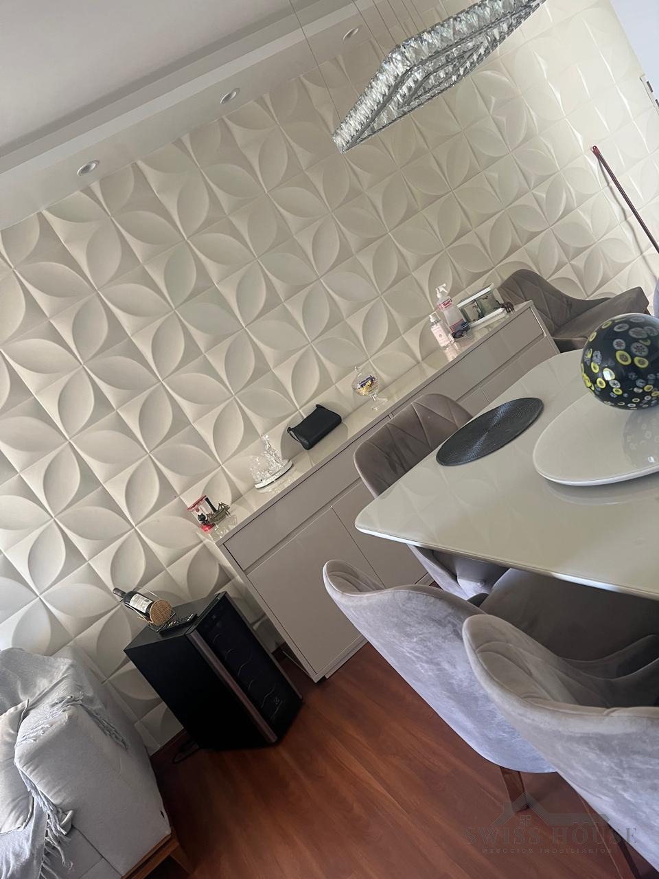 A sala para 2 ambientes é um grande destaque, com acabamento diferenciado e muito bom gosto: possui revestimento 3D em uma das paredes, espelho ao lado da mesa de jantar, sancas de gesso, iluminação indireta, lustre e ar-condicionado, criando um ambiente elegante, aconchegante e bem iluminado.