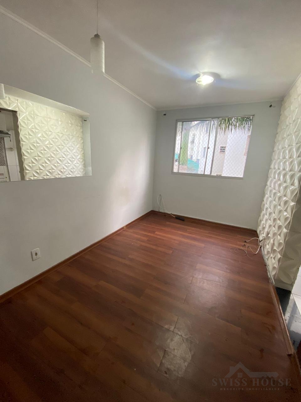 Apartamento com 2 quartos, ambos com carpete de madeira, oferecendo conforto e aconchego. Possui sala para dois ambientes, cozinha americana com armários planejados, área de serviço e 1 banheiro com box.