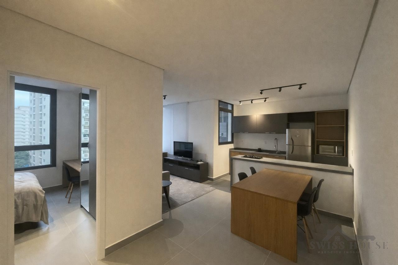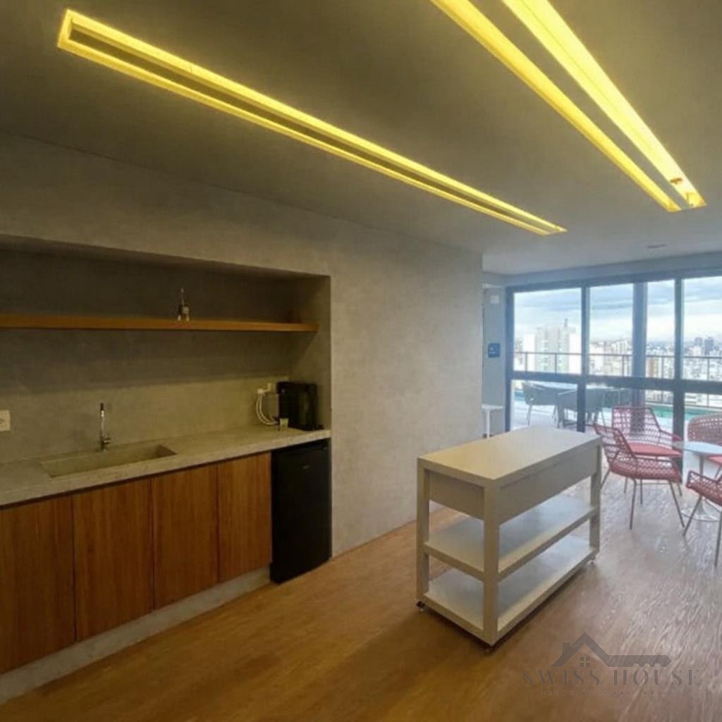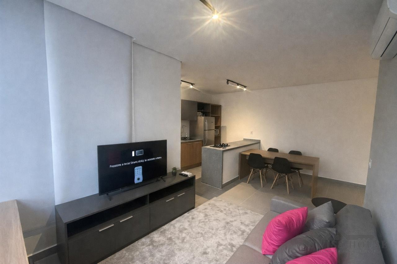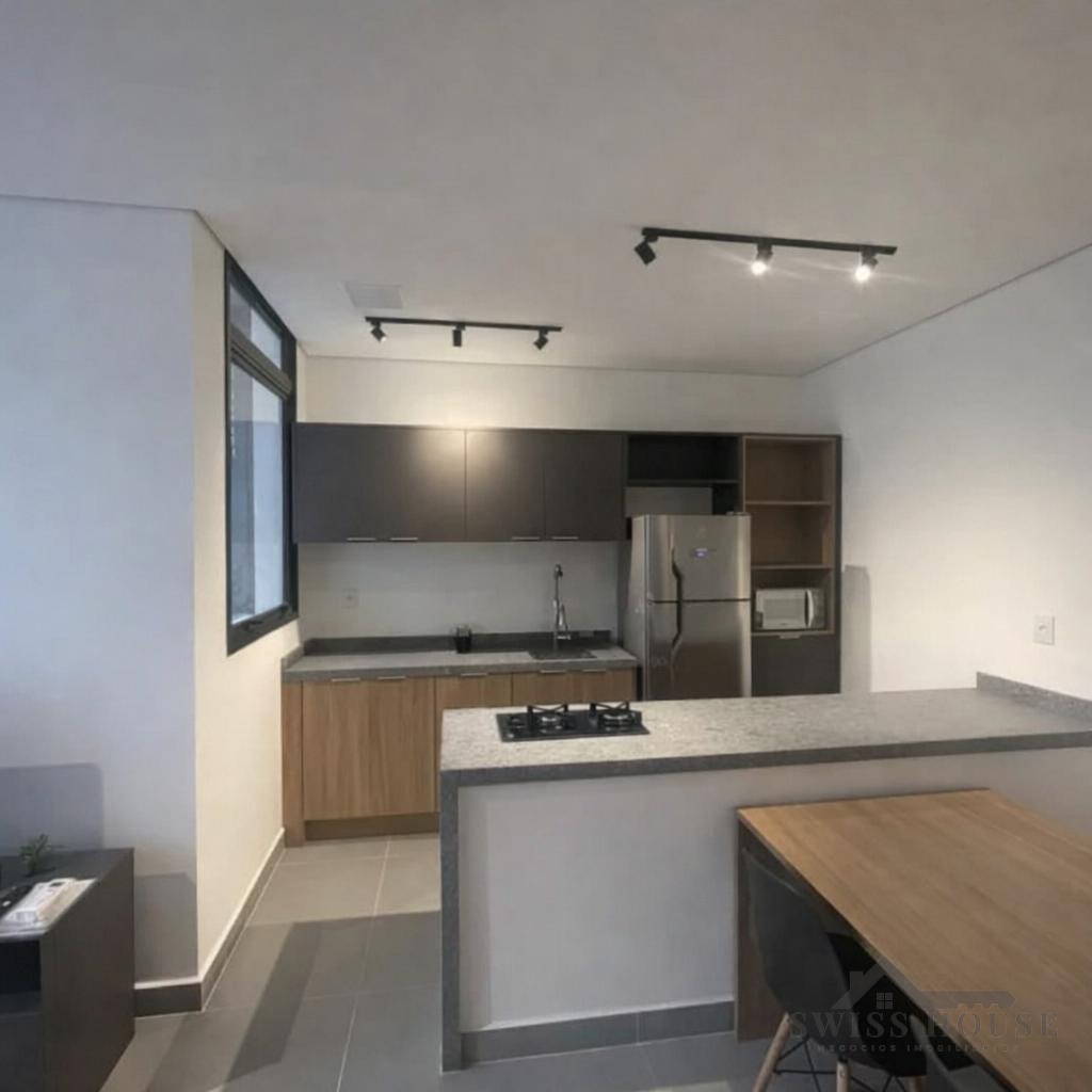 O imóvel conta com living para dois ambientes, integrado à cozinha americana, equipada com armários planejados e eletrodomésticos embutidos. Possui 1 quarto com armários, banheiro com box blindex, persiana automatizada no dormitório e porta com fechadura eletrônica, oferecendo mais segurança e comodidade no dia a dia.