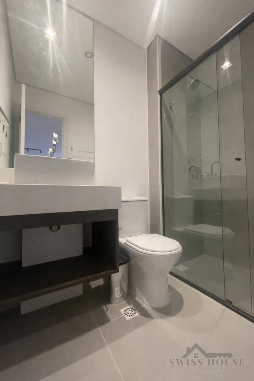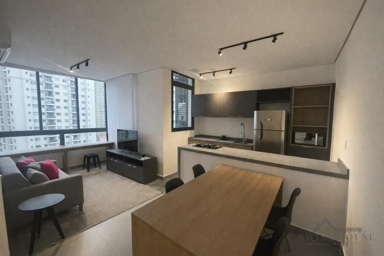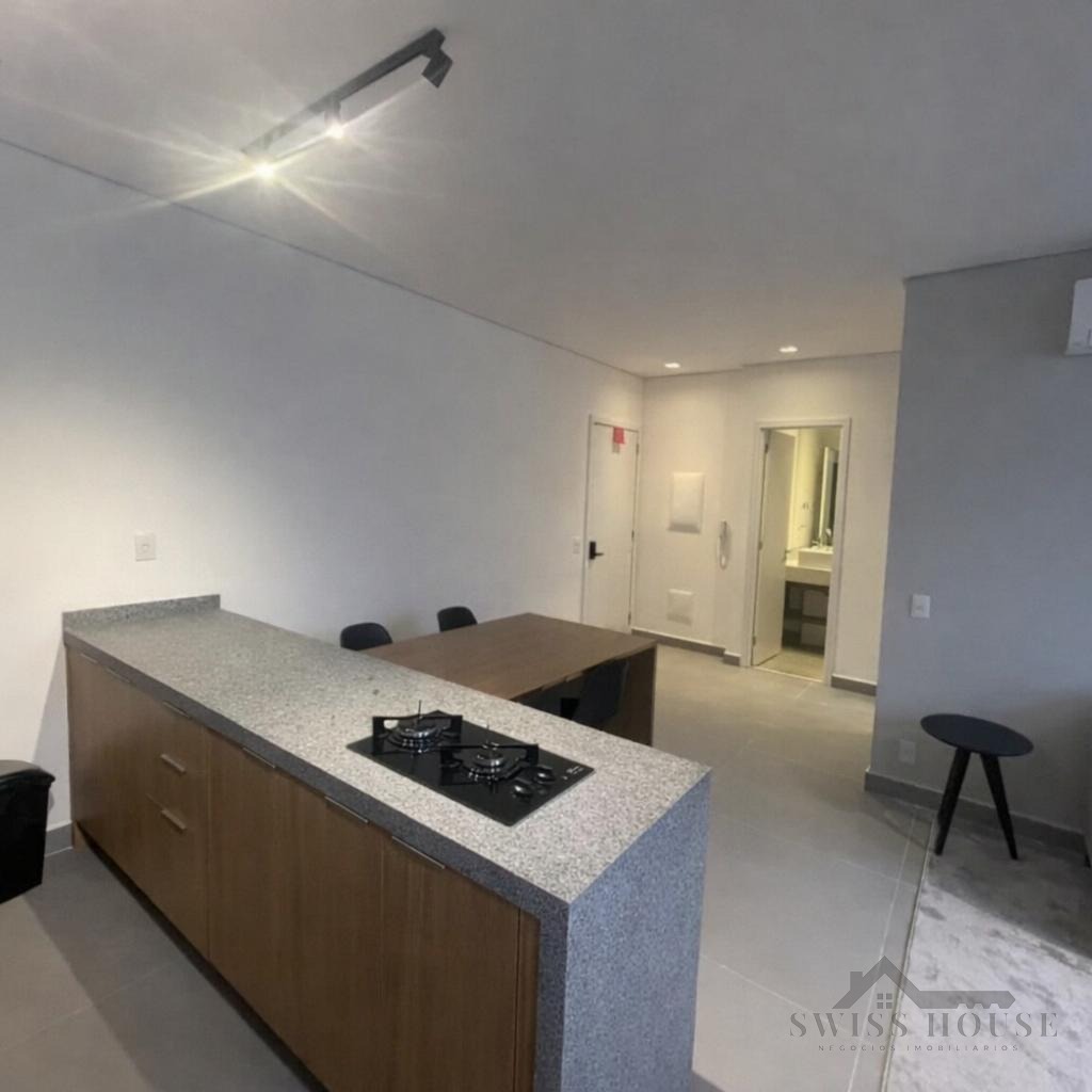 O imóvel conta com living para dois ambientes, integrado à cozinha americana, equipada com armários planejados e eletrodomésticos embutidos. Possui 1 quarto com armários, banheiro com box blindex, persiana automatizada no dormitório e porta com fechadura eletrônica, oferecendo mais segurança e comodidade no dia a dia.