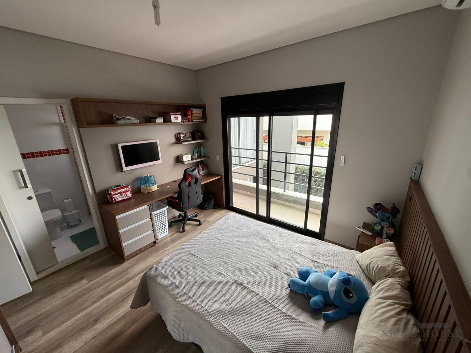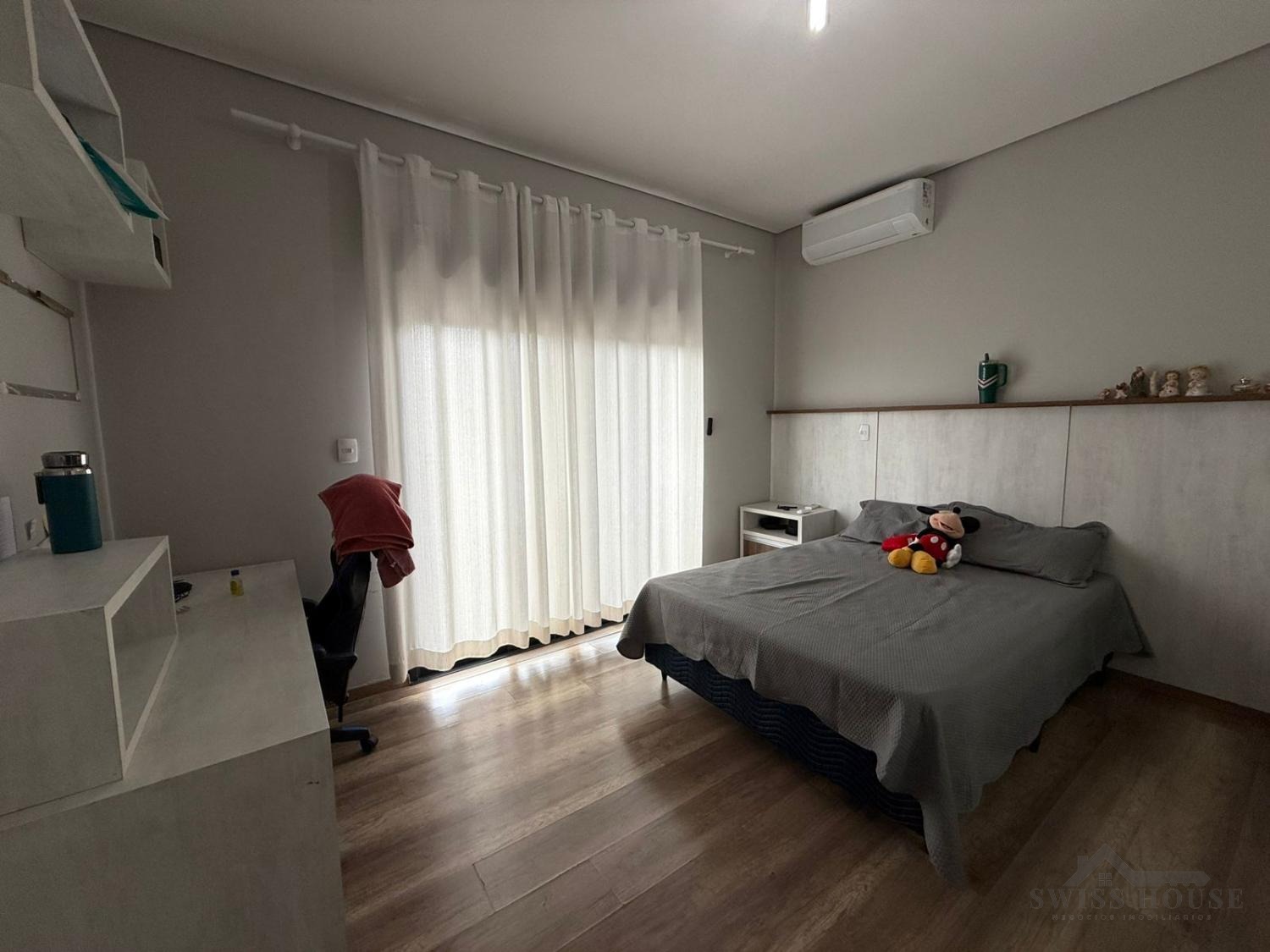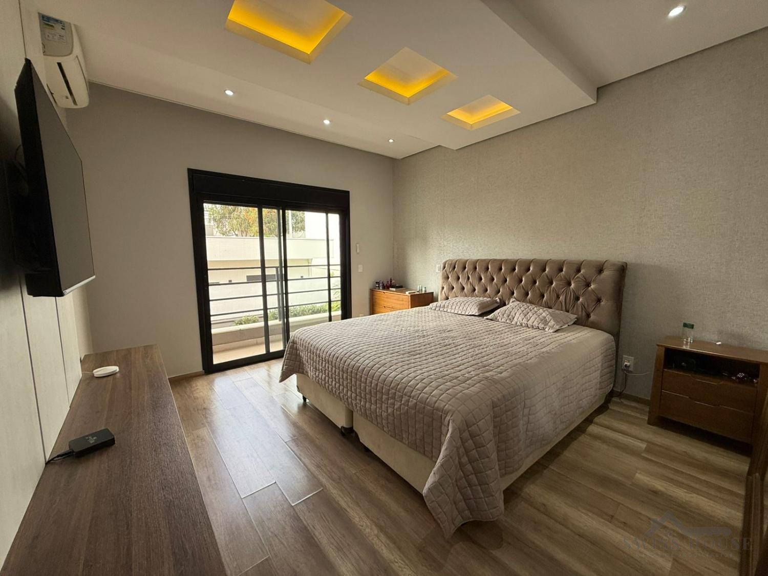 No piso superior, são 3 suítes equipadas com armários planejados e ar-condicionado, incluindo uma ampla suíte master com closet e persianas automatizadas, oferecendo um verdadeiro refúgio de conforto e privacidade.
