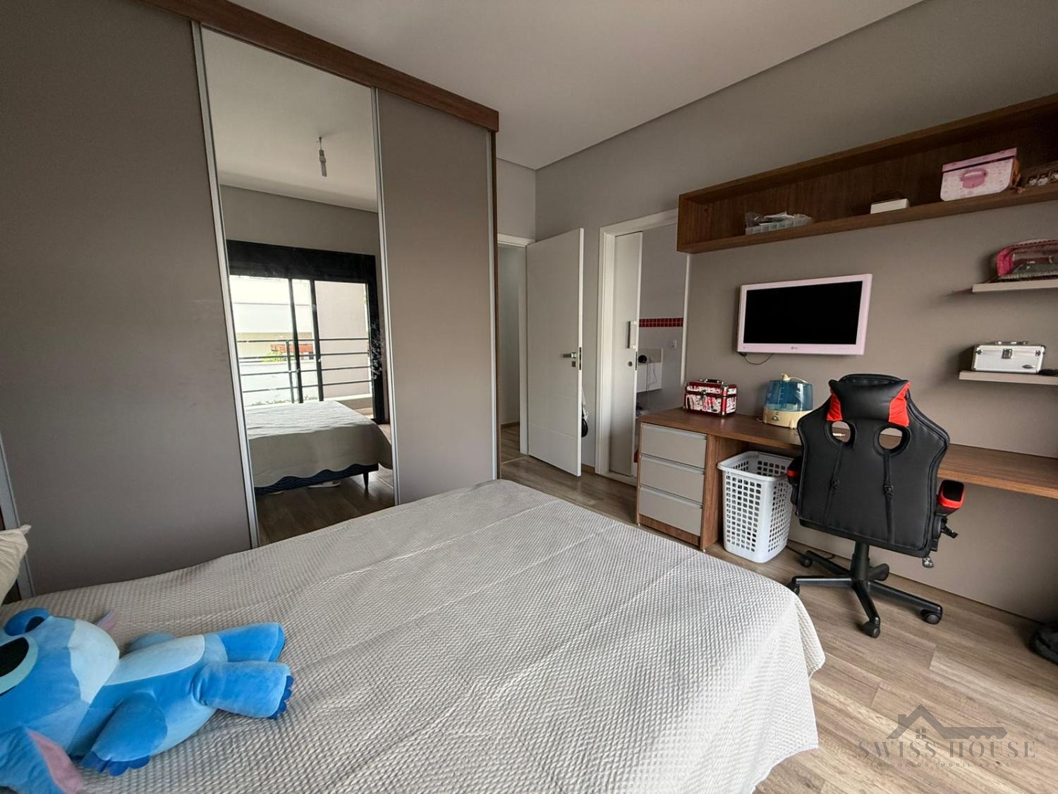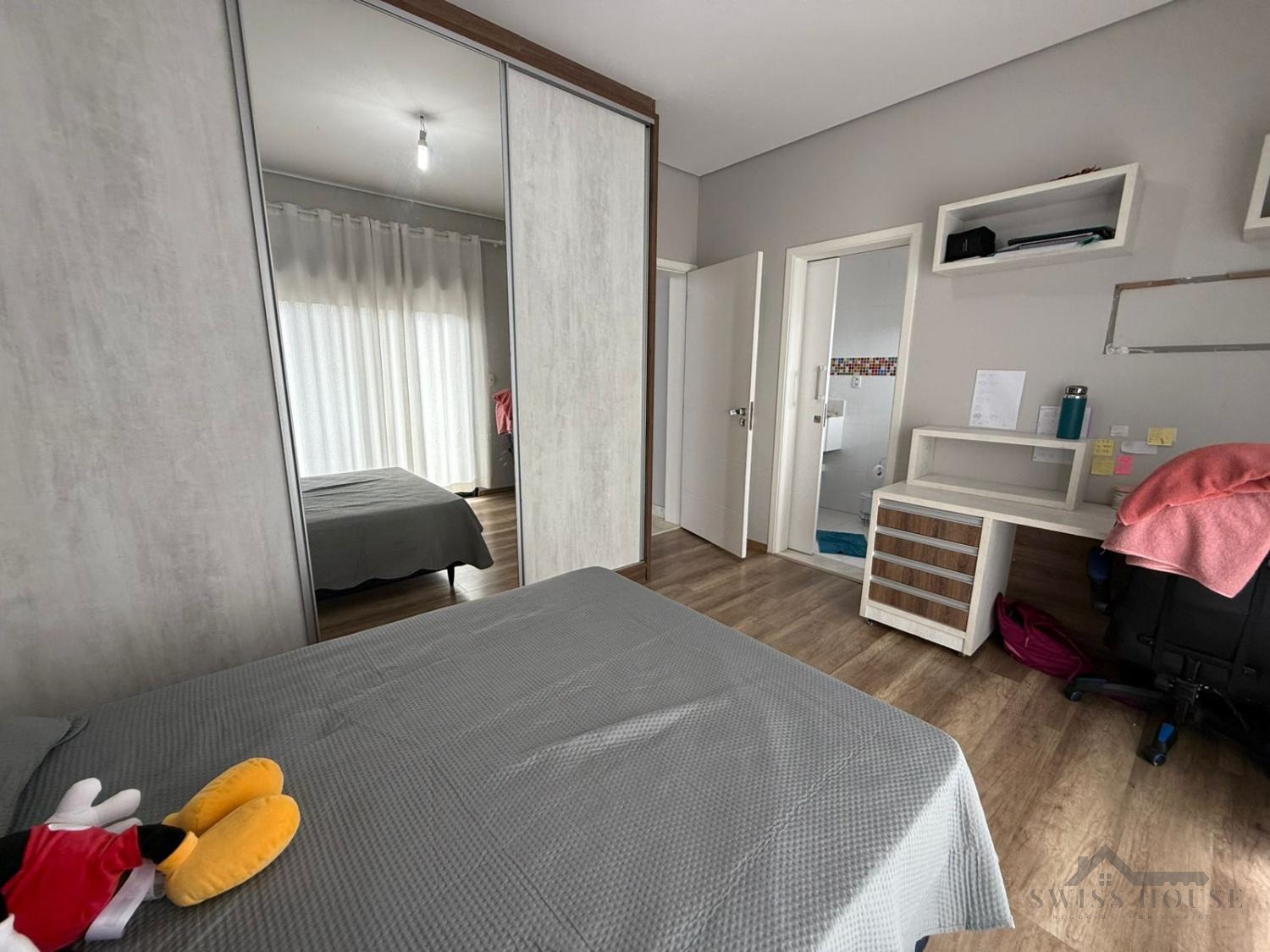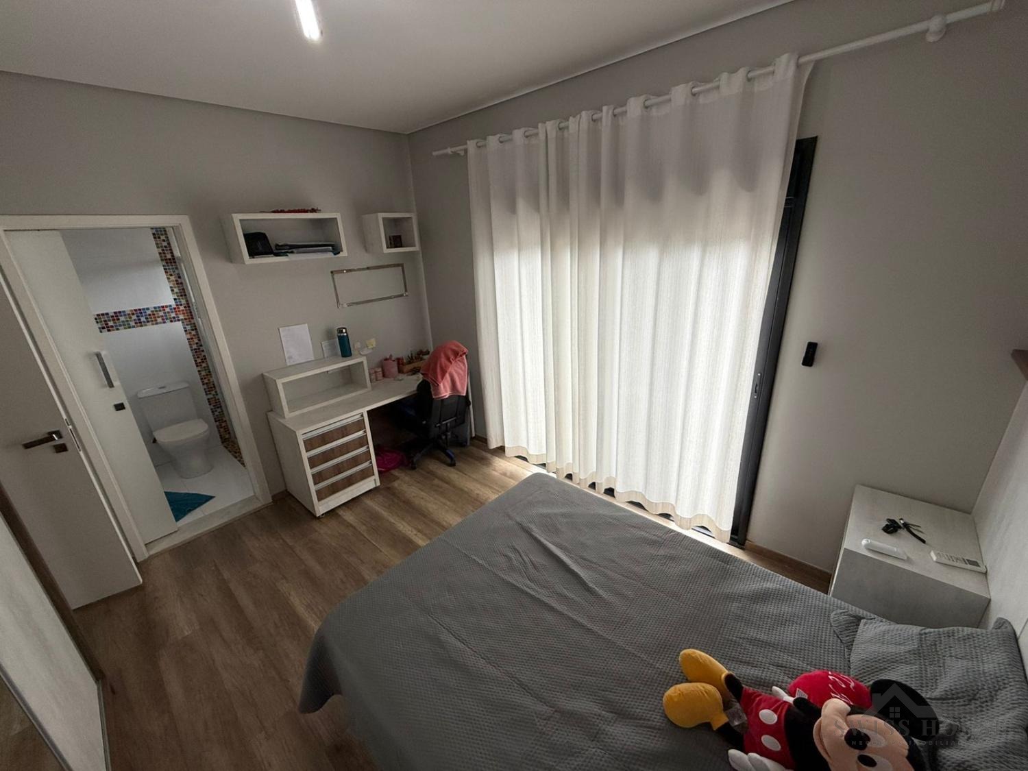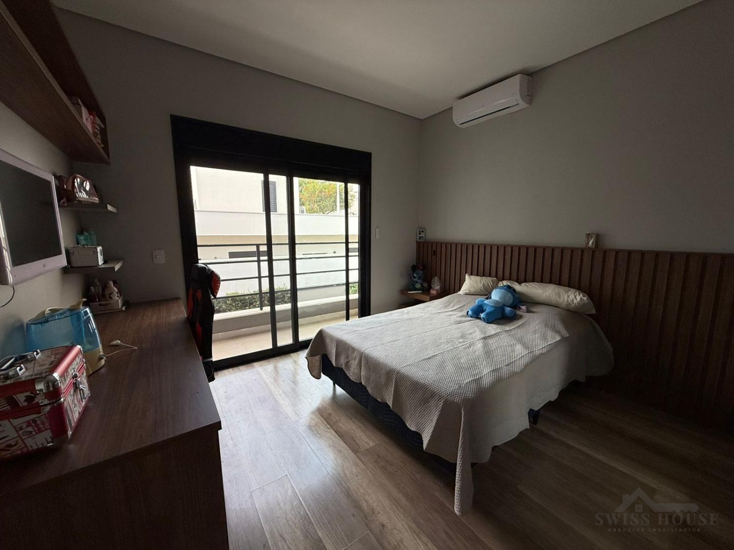 No piso superior, são 3 suítes equipadas com armários planejados e ar-condicionado, incluindo uma ampla suíte master com closet e persianas automatizadas, oferecendo um verdadeiro refúgio de conforto e privacidade.
