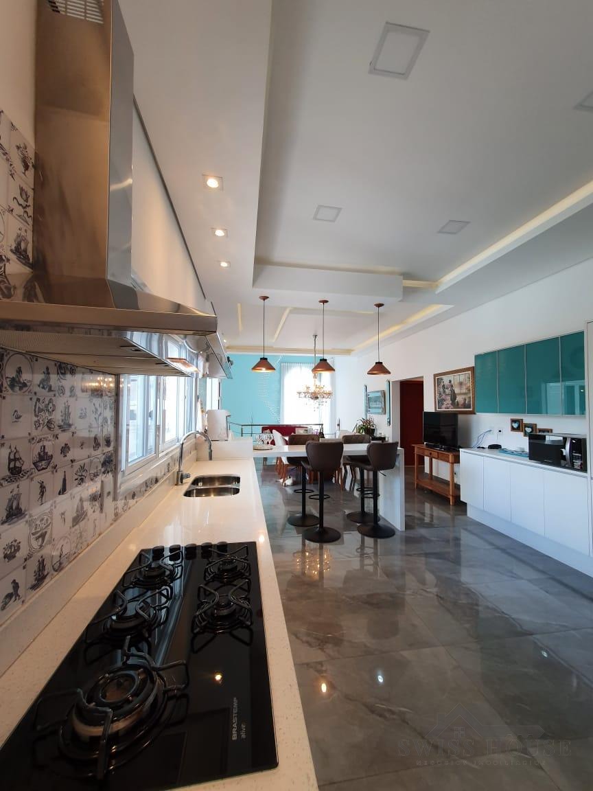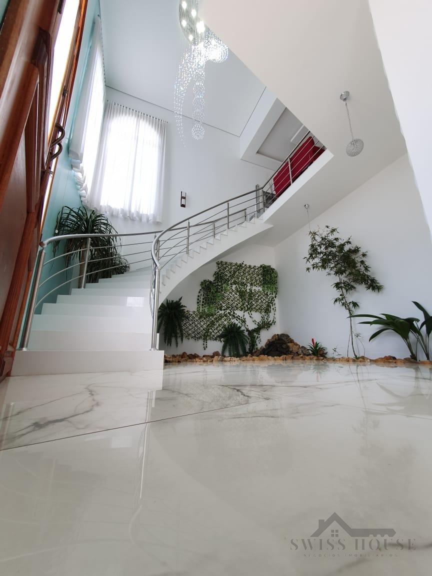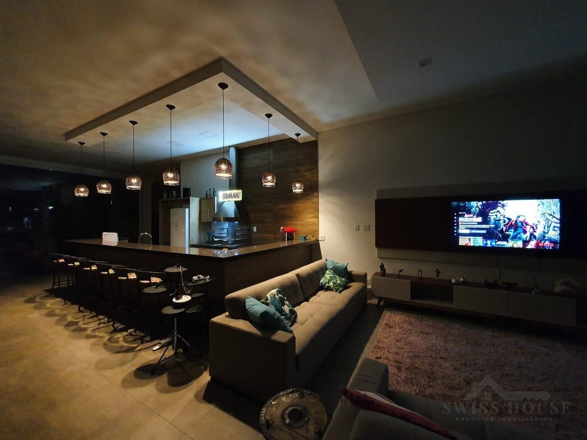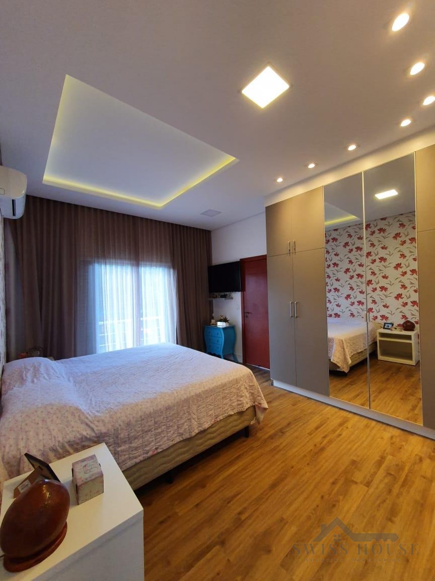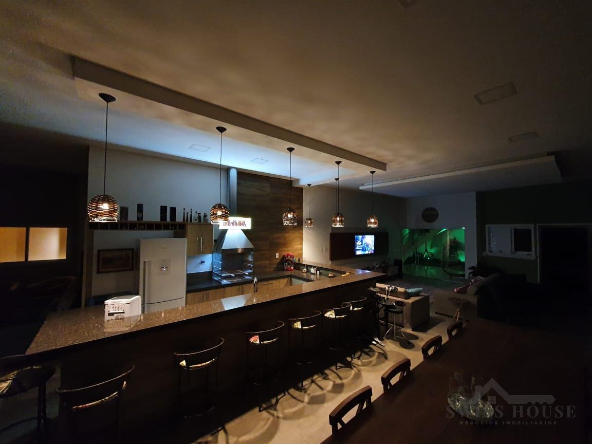 O sobrado conta com sala social com painel de TV decorativo, teto rebaixado em gesso com iluminação em LED, sala de jantar, varanda e cozinha planejada com aquecimento solar na pia, armários com torre para micro-ondas, geladeira e forno embutido, além de despensa. São 4 suítes, sendo 1 máster, todas com armários planejados. O imóvel dispõe ainda de sala de cinema com pé-direito duplo, escritório, lavabo, área gourmet com churrasqueira, piscina, suíte na área gourmet, oficina e 4 vagas de garagem.