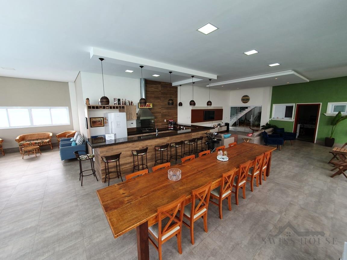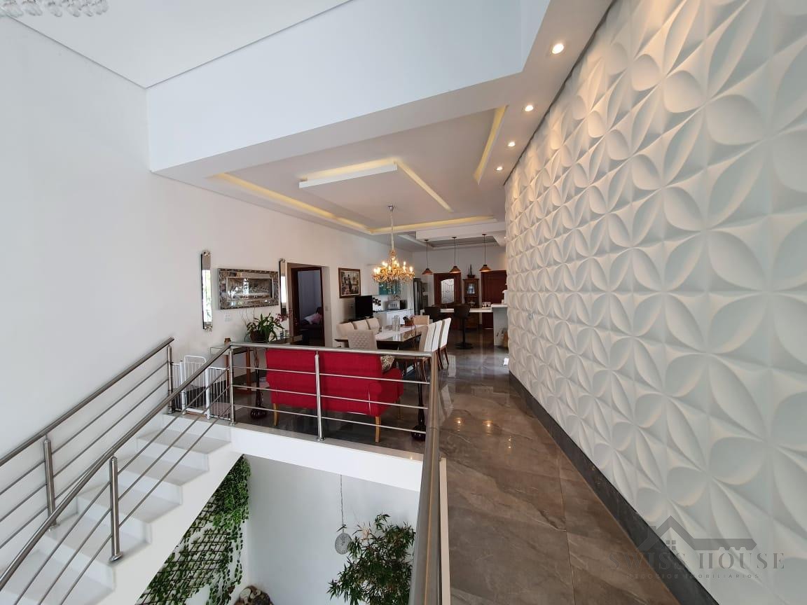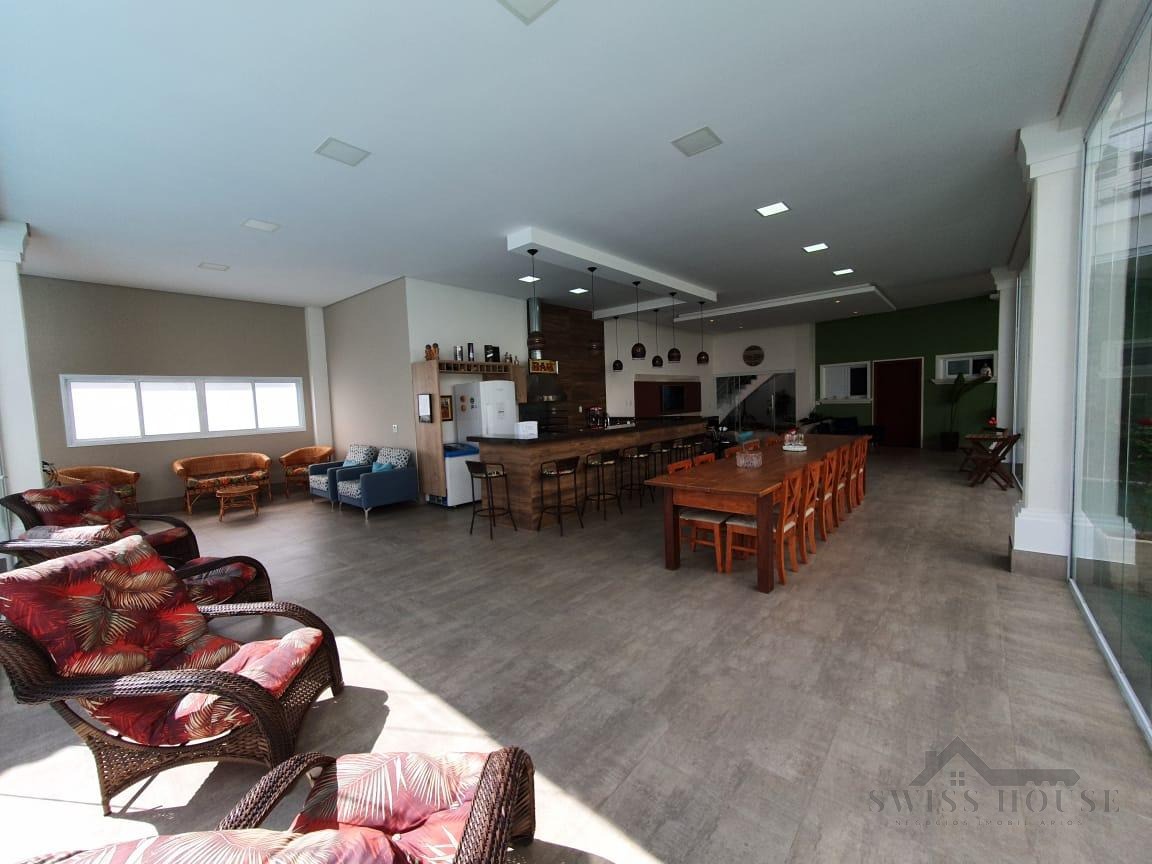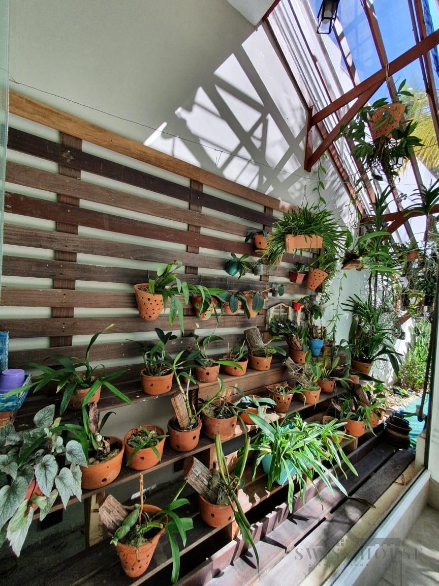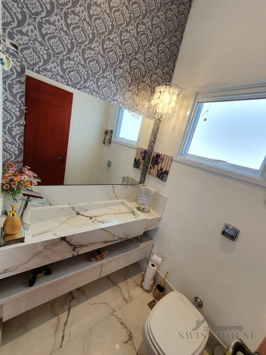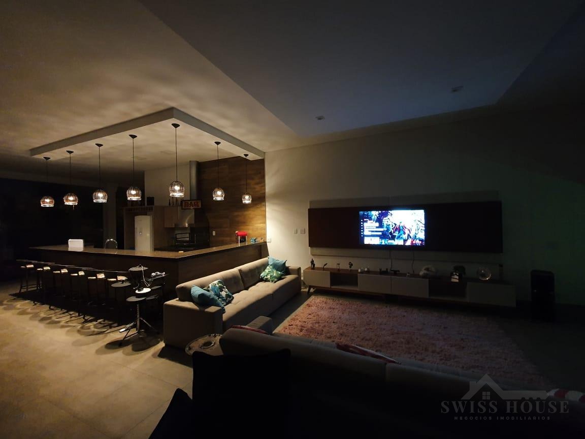 O sobrado conta com sala social com painel de TV decorativo, teto rebaixado em gesso com iluminação em LED, sala de jantar, varanda e cozinha planejada com aquecimento solar na pia, armários com torre para micro-ondas, geladeira e forno embutido, além de despensa. São 4 suítes, sendo 1 máster, todas com armários planejados. O imóvel dispõe ainda de sala de cinema com pé-direito duplo, escritório, lavabo, área gourmet com churrasqueira, piscina, suíte na área gourmet, oficina e 4 vagas de garagem.