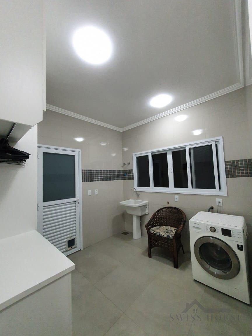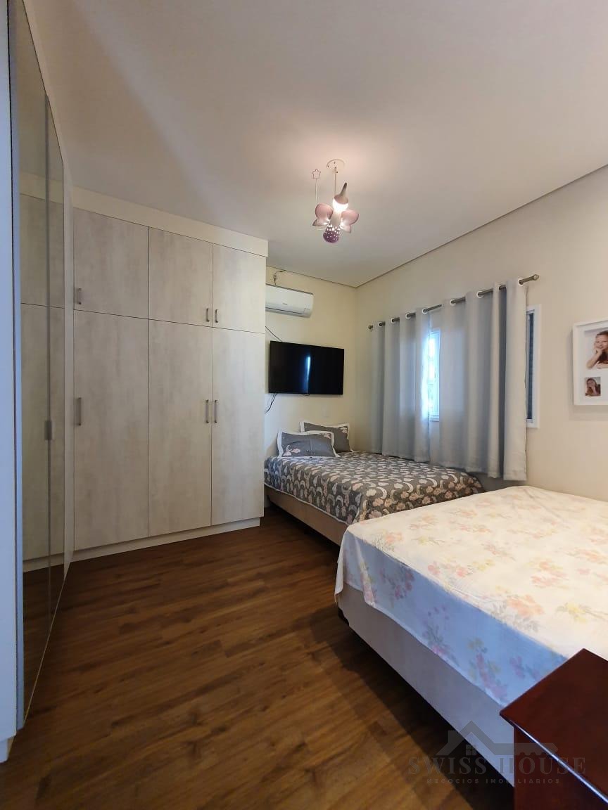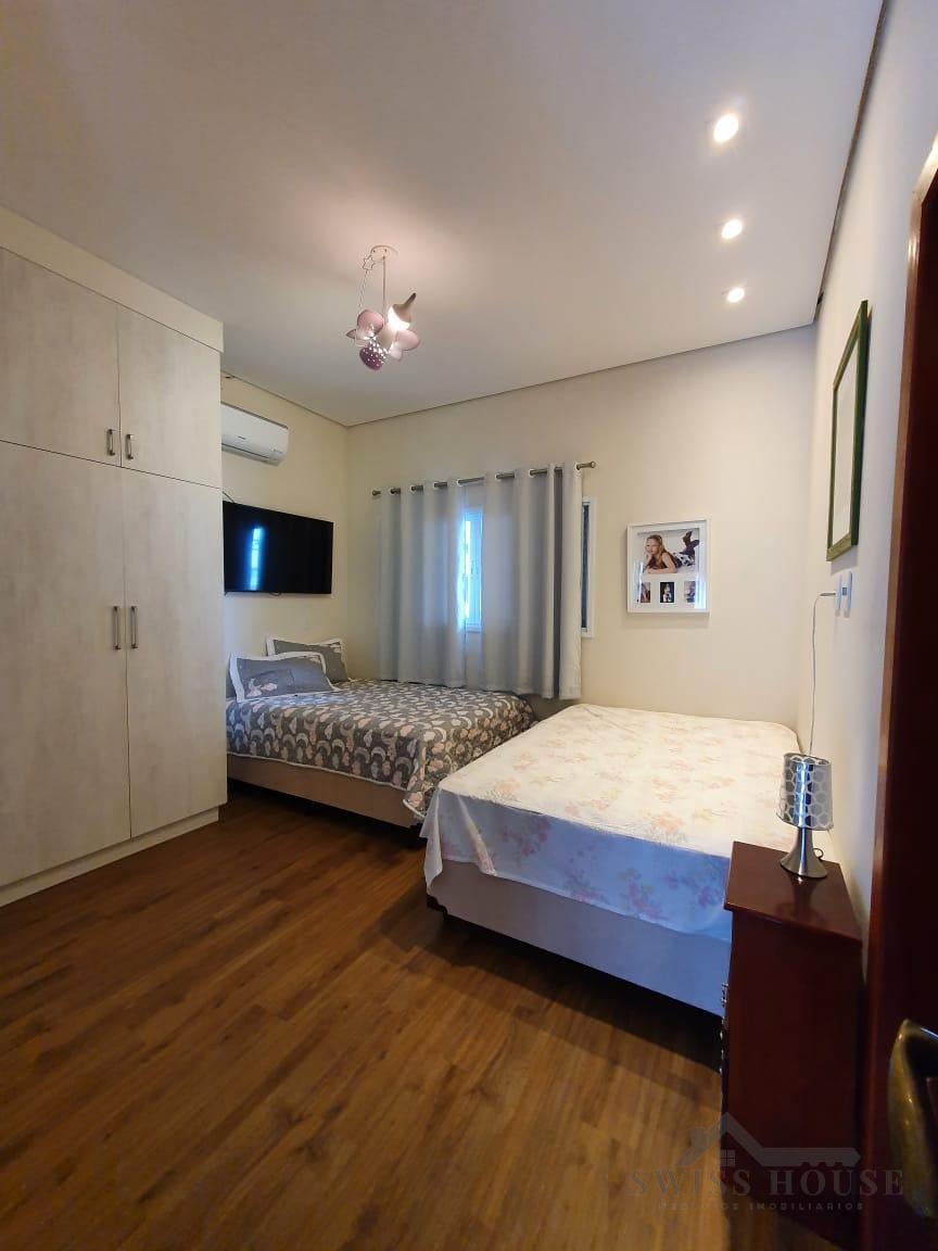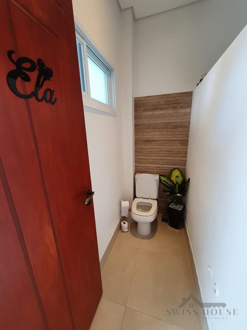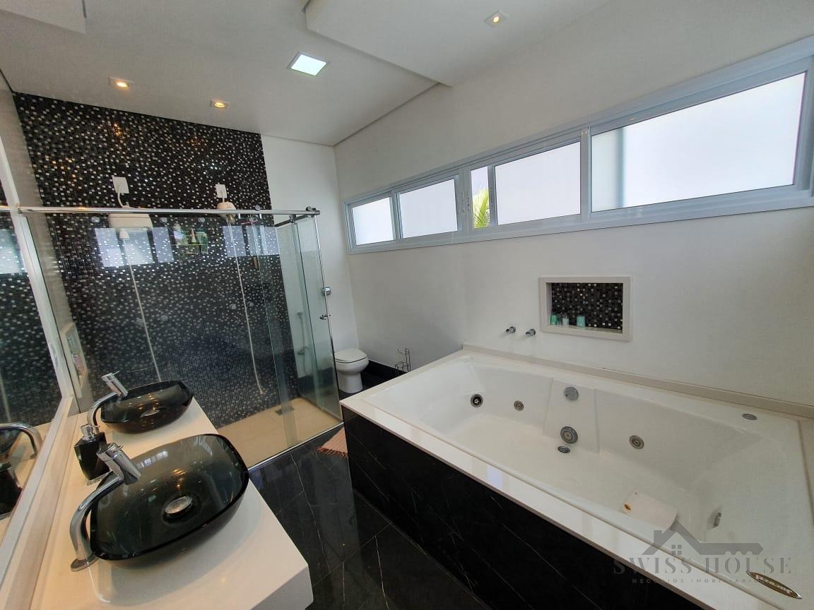 O sobrado conta com sala social com painel de TV decorativo, teto rebaixado em gesso com iluminação em LED, sala de jantar, varanda e cozinha planejada com aquecimento solar na pia, armários com torre para micro-ondas, geladeira e forno embutido, além de despensa. São 4 suítes, sendo 1 máster, todas com armários planejados. O imóvel dispõe ainda de sala de cinema com pé-direito duplo, escritório, lavabo, área gourmet com churrasqueira, piscina, suíte na área gourmet, oficina e 4 vagas de garagem.
