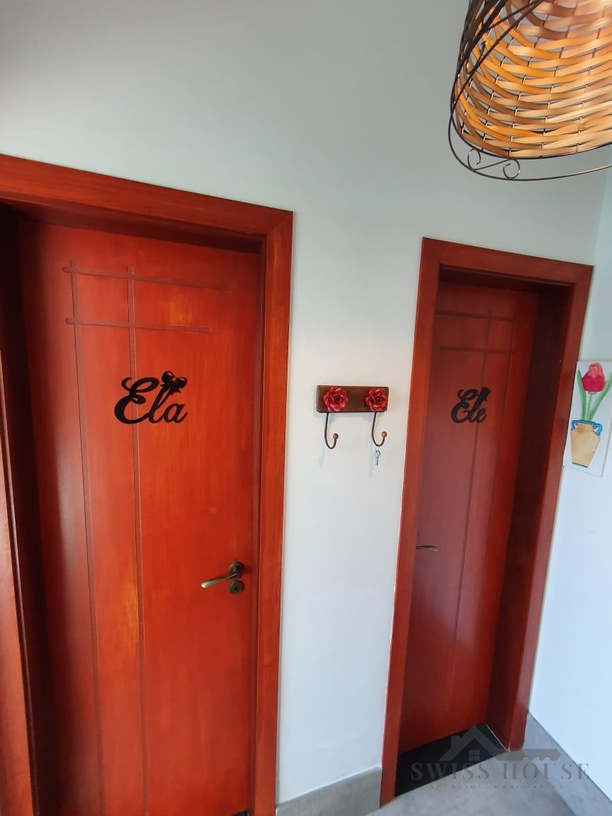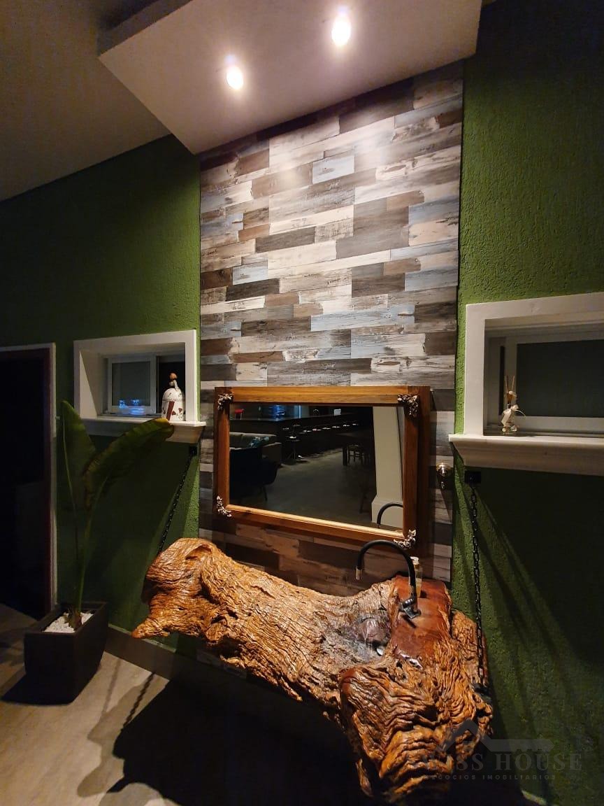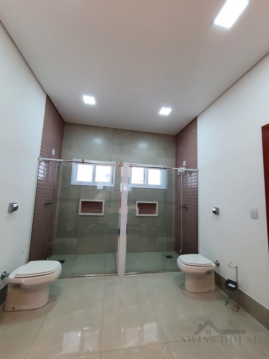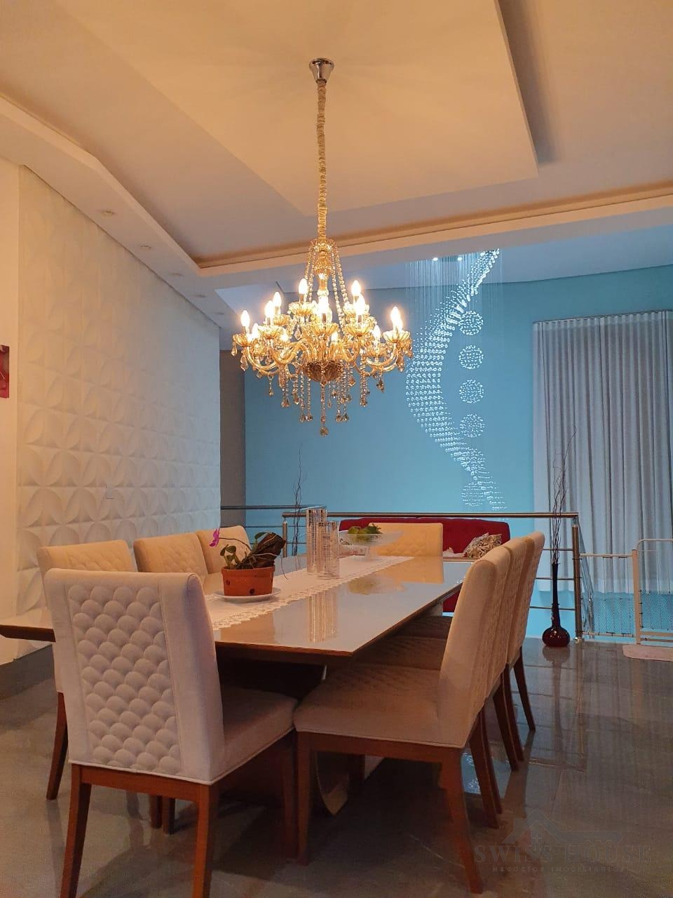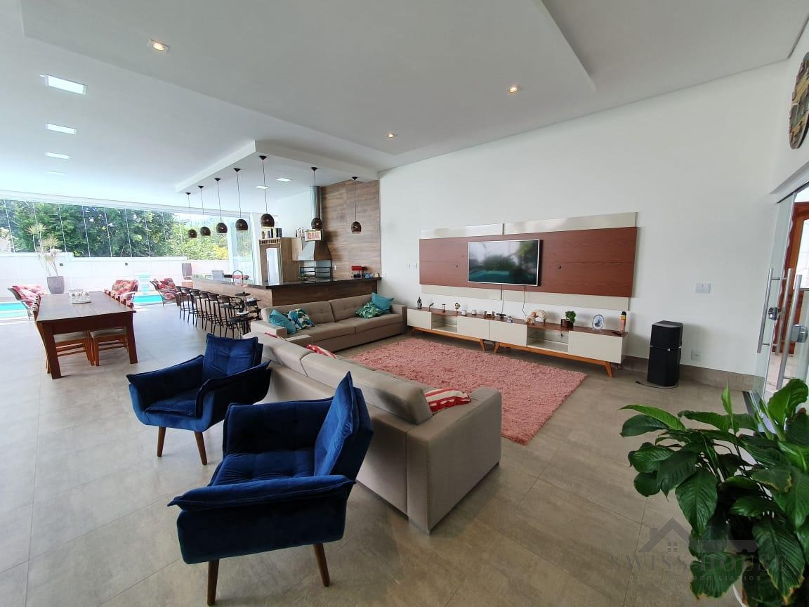 O sobrado conta com sala social com painel de TV decorativo, teto rebaixado em gesso com iluminação em LED, sala de jantar, varanda e cozinha planejada com aquecimento solar na pia, armários com torre para micro-ondas, geladeira e forno embutido, além de despensa. São 4 suítes, sendo 1 máster, todas com armários planejados. O imóvel dispõe ainda de sala de cinema com pé-direito duplo, escritório, lavabo, área gourmet com churrasqueira, piscina, suíte na área gourmet, oficina e 4 vagas de garagem.