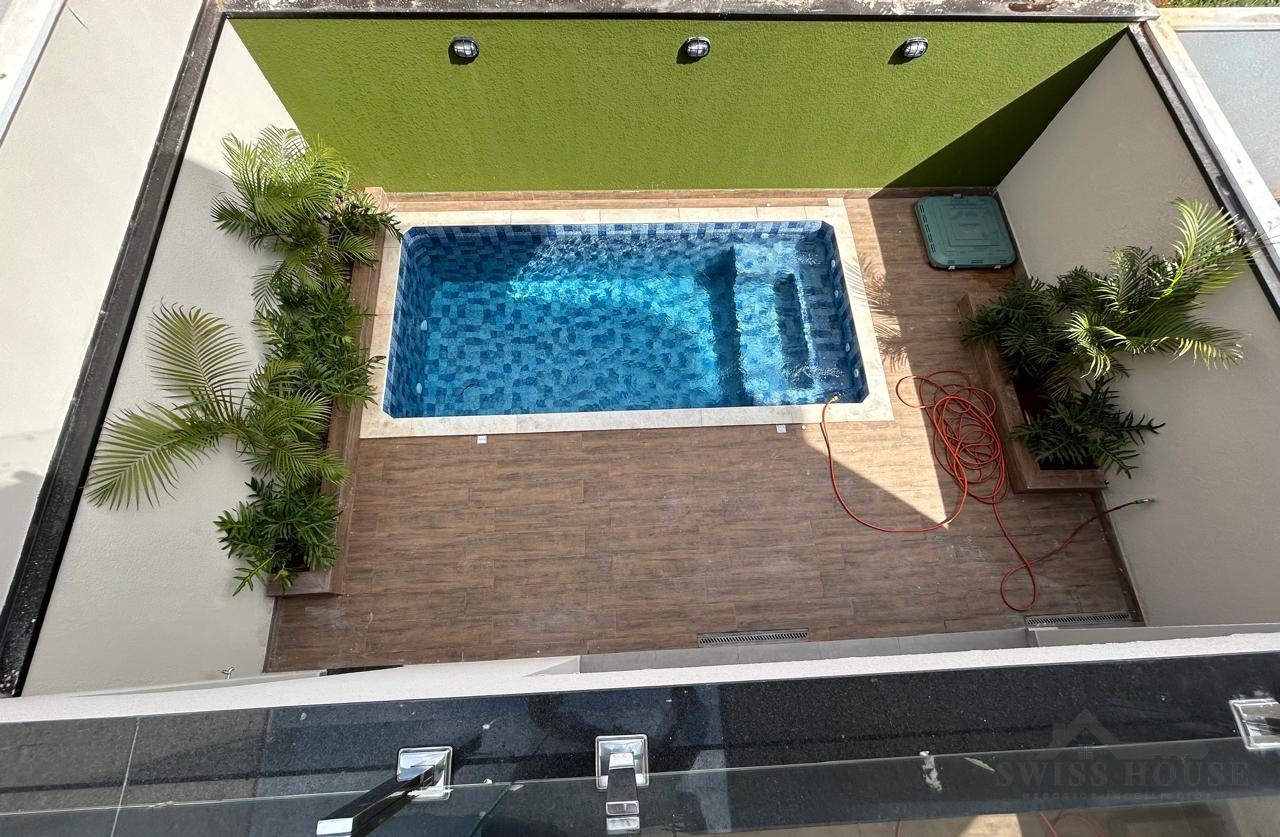 Com 3 quartos sendo 1 suíte com closet, escritório com estrutura pronta para ar condicionado, lavabo, sala grande para home e jantar com cozinha americana já com cooktop, área de serviço, dispensa e depósito acoplados a cozinha, área de luz , a casa com estrada de serviço lateral, piscina com luzes, hidro e aquecida, aquecimento solar Boiler para água quente da casa e piscina, infraestrutura de ar condicionado em toda casa, 4 vagas de garagem.