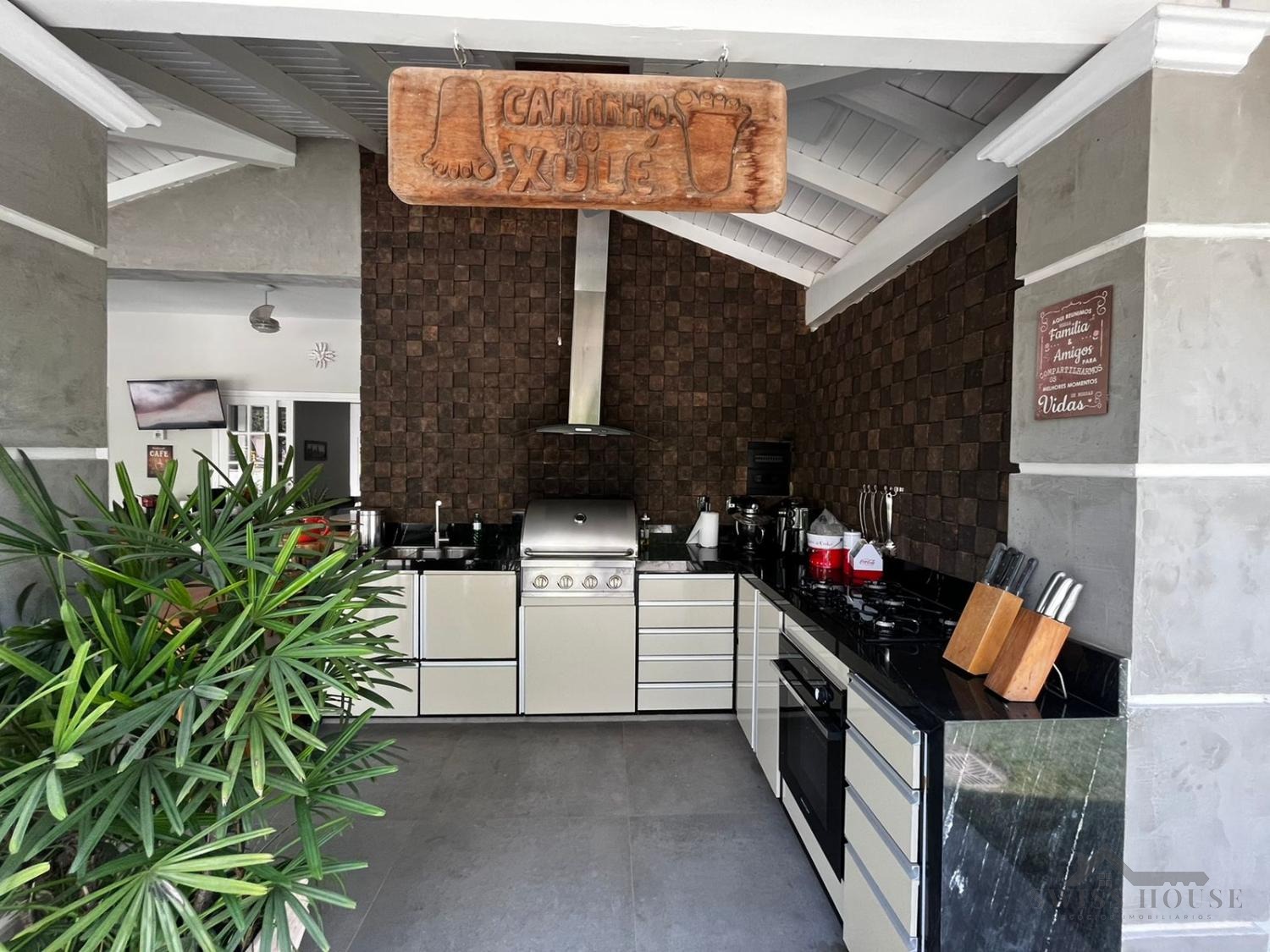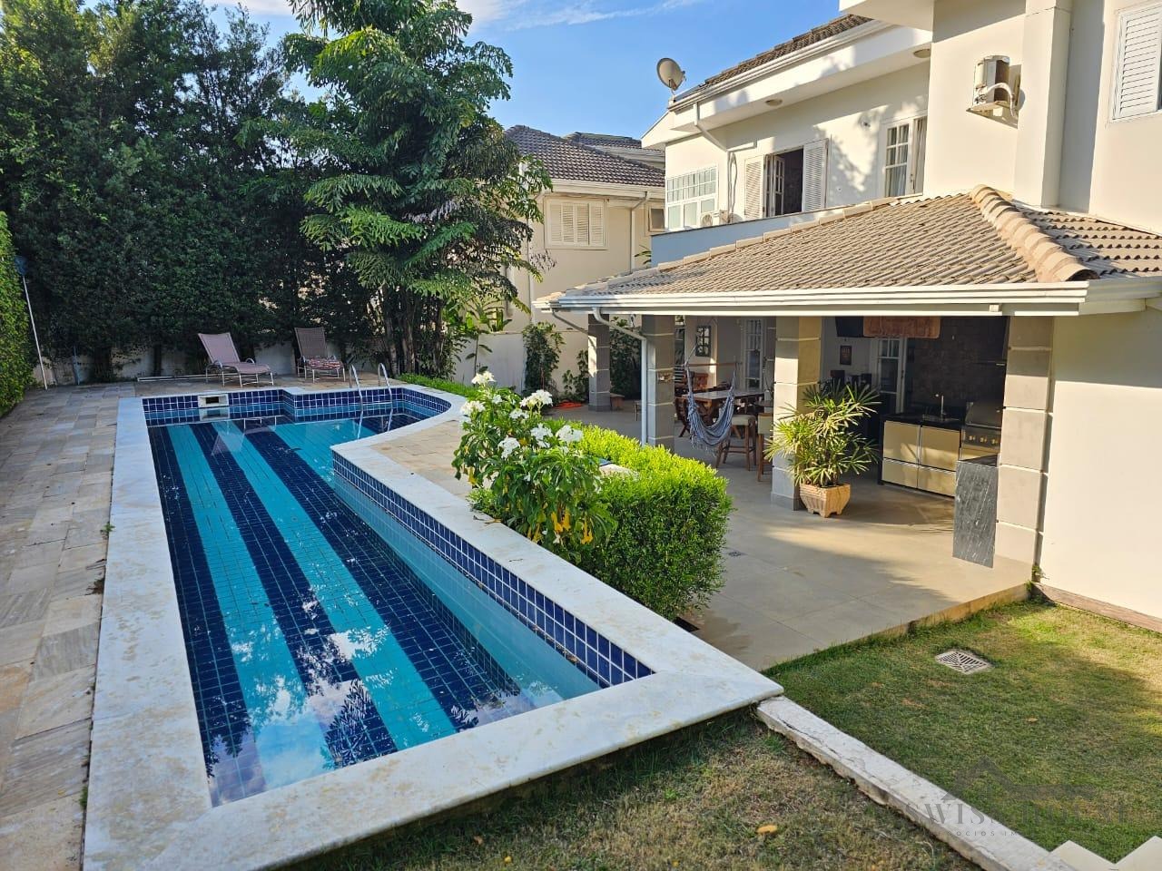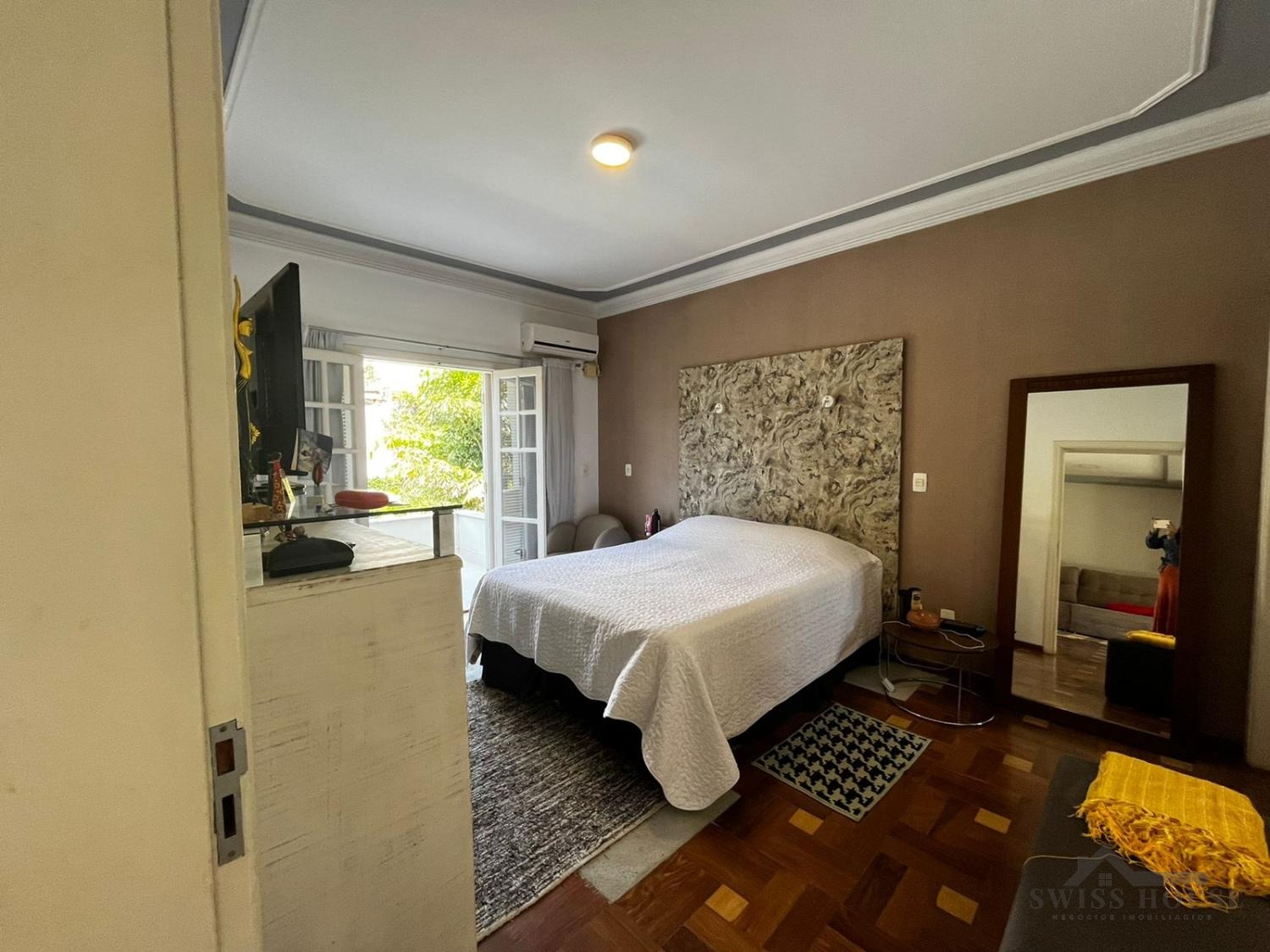 No pavimento superior, o imóvel oferece 3 suítes, sendo 1 master com closet e banheira de hidromassagem, além de sala de TV e varanda. O piso é em tacão de madeira Cumaru (30x10 cm).