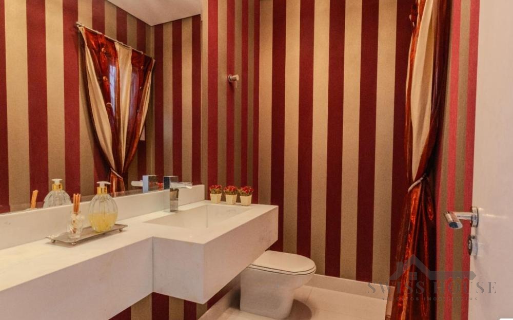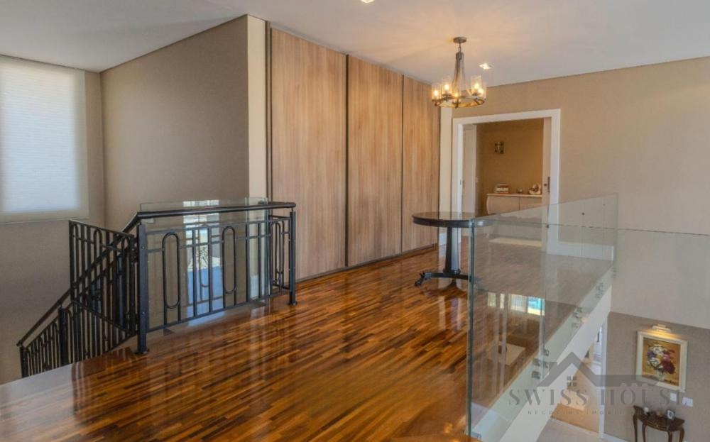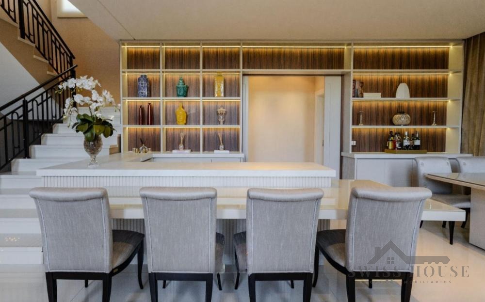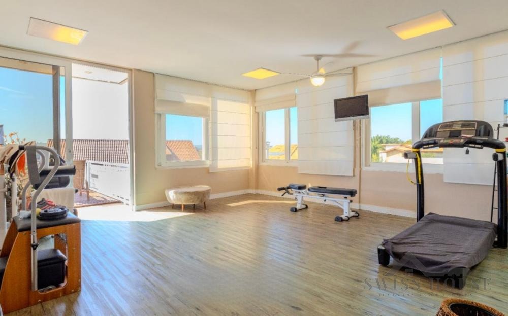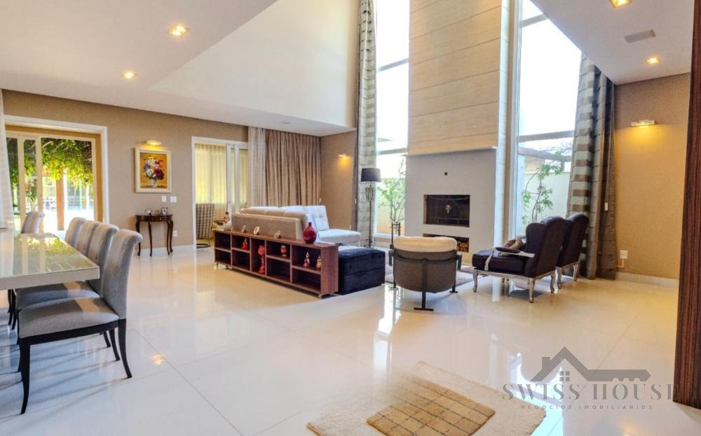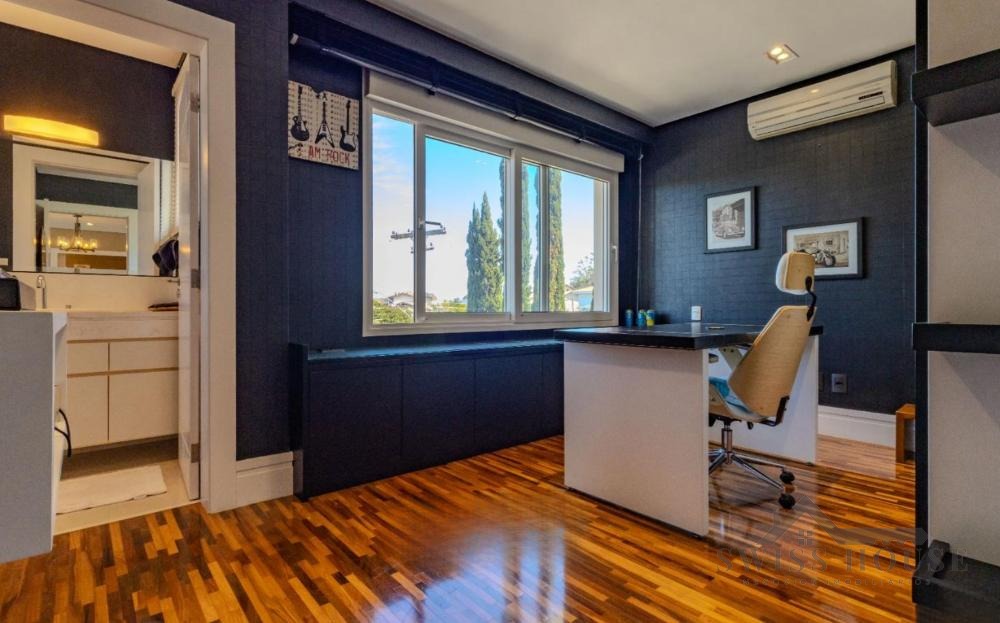 No pavimento térreo, conta com hall de entrada, escritório, lavabo, sala de home theater, adega, além de amplas salas de estar, jantar e lareira com pé-direito duplo. Possui ainda varanda espaçosa com fechamento em vidro, copa e cozinha planejada, além de 1 suíte completa para hóspedes.