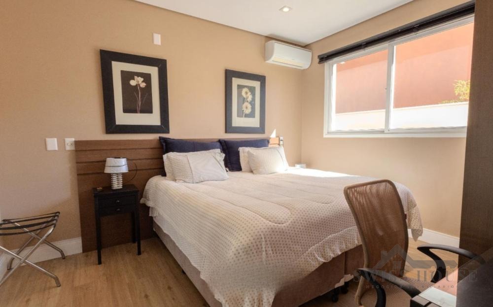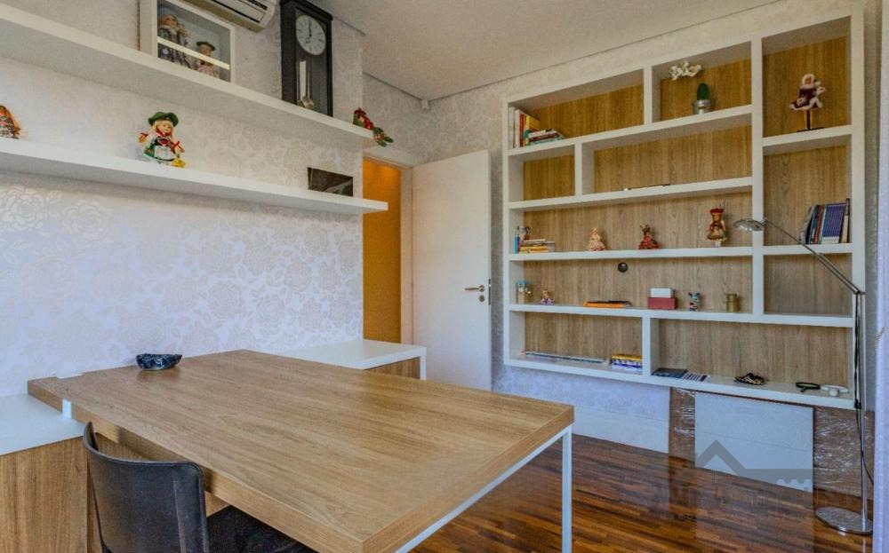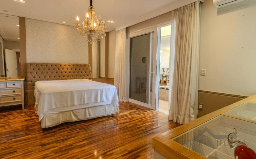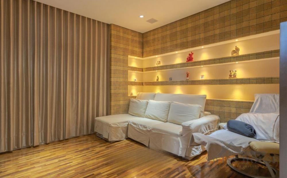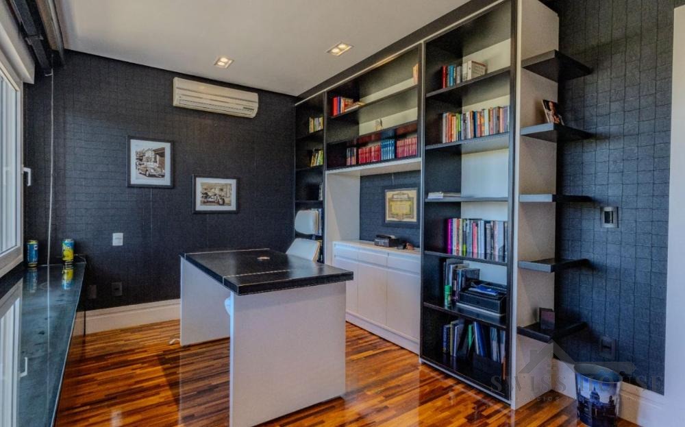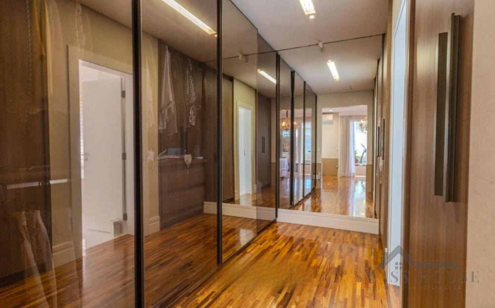 No pavimento térreo, conta com hall de entrada, escritório, lavabo, sala de home theater, adega, além de amplas salas de estar, jantar e lareira com pé-direito duplo. Possui ainda varanda espaçosa com fechamento em vidro, copa e cozinha planejada, além de 1 suíte completa para hóspedes.