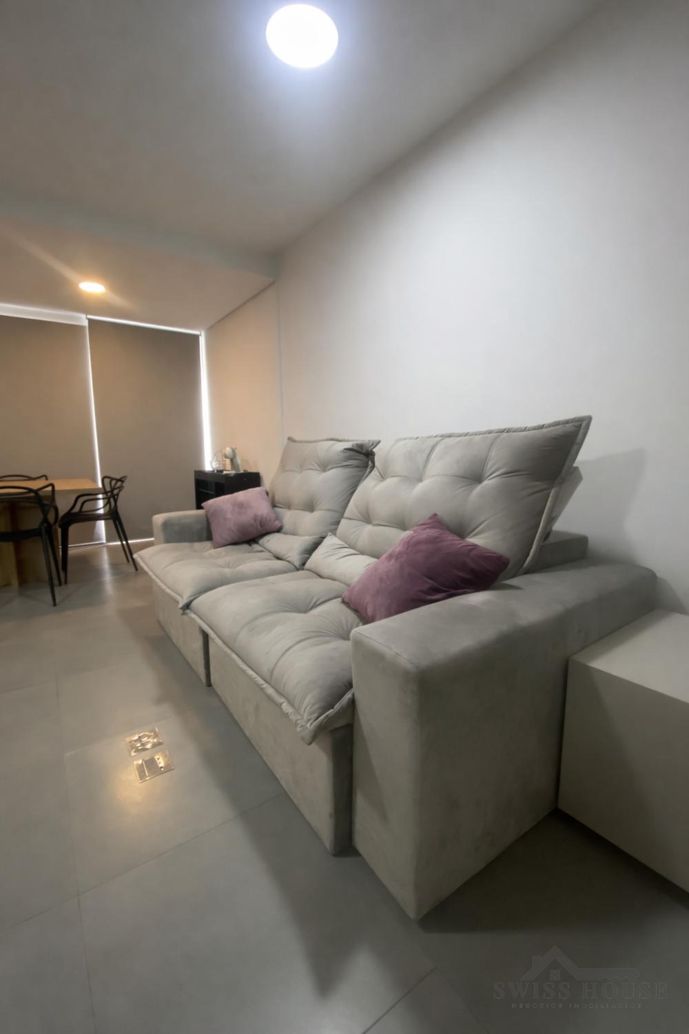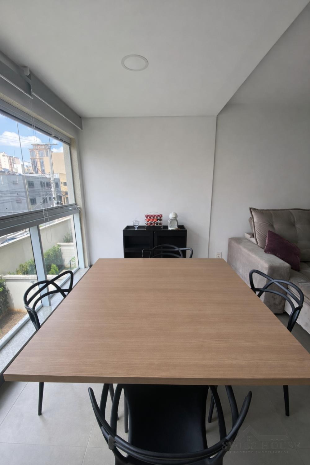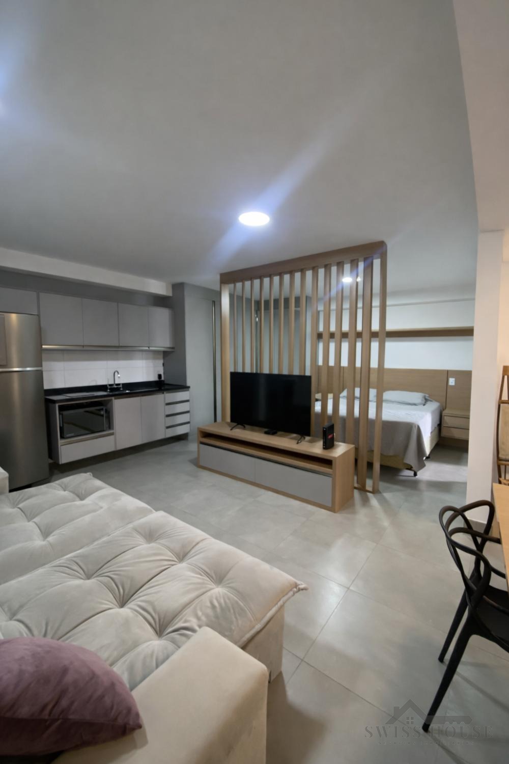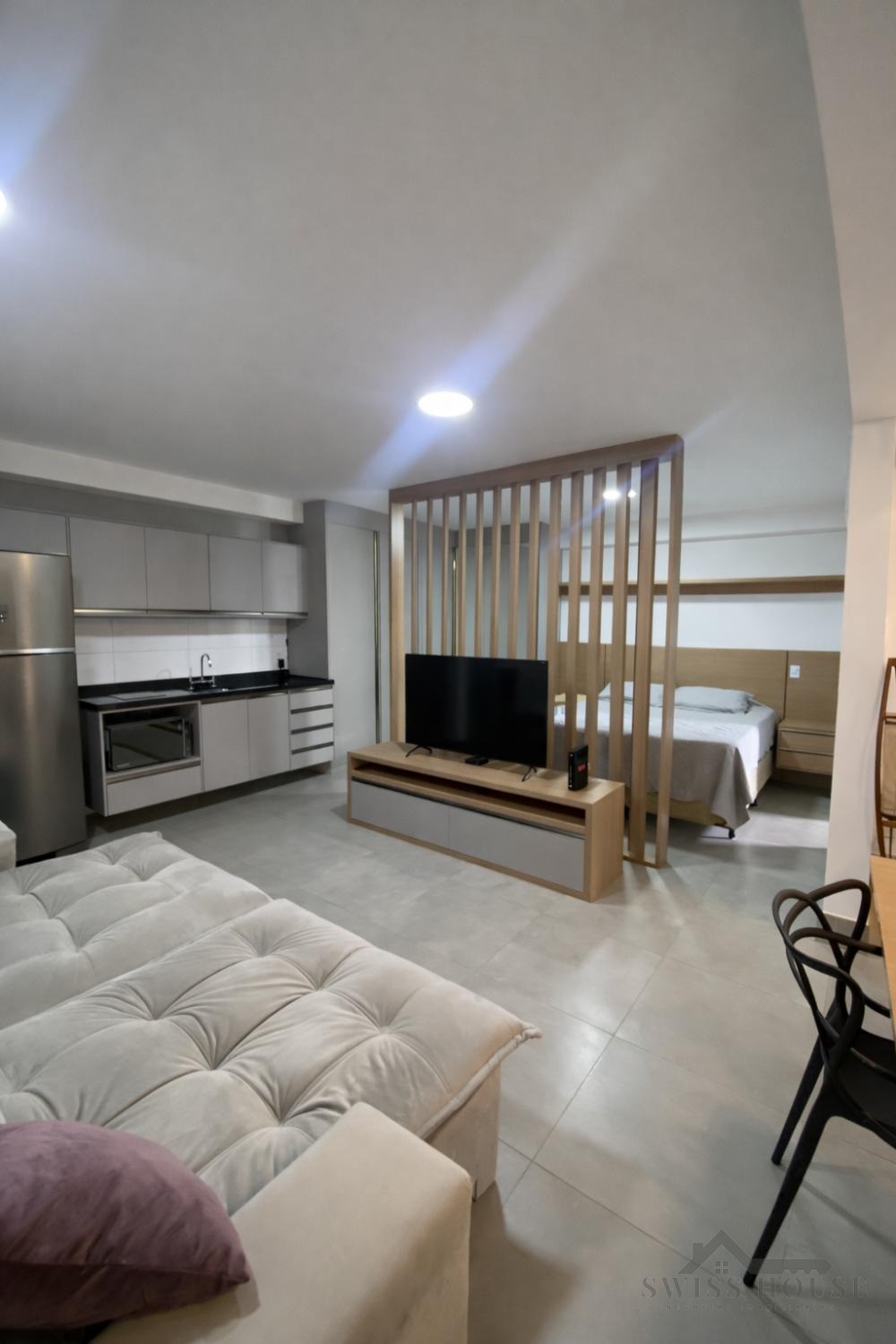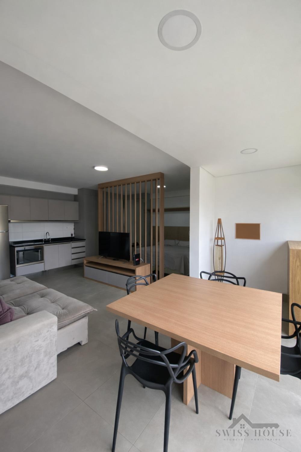 A cozinha é planejada e equipada, com eletrodomésticos, integrando-se de forma prática ao ambiente. O imóvel será entregue com sofá e mesa de jantar, oferecendo mais comodidade.